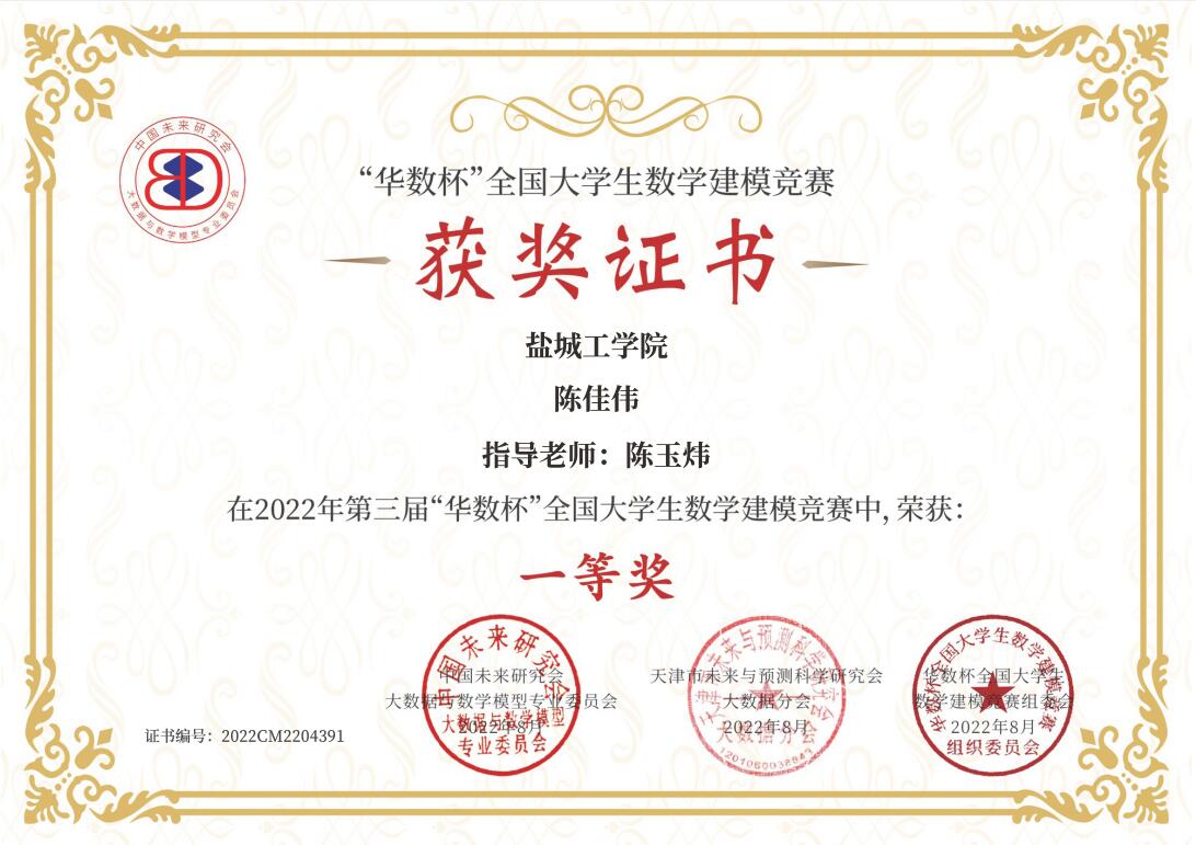 近日,2022年第三届“华数杯”全国大学生数学建模竞赛获奖名单公布。我院B能动202陈佳伟、B能动202赵健及B车辆202赵淼琪三位同学组成的参赛队伍获得本科生组一等奖。