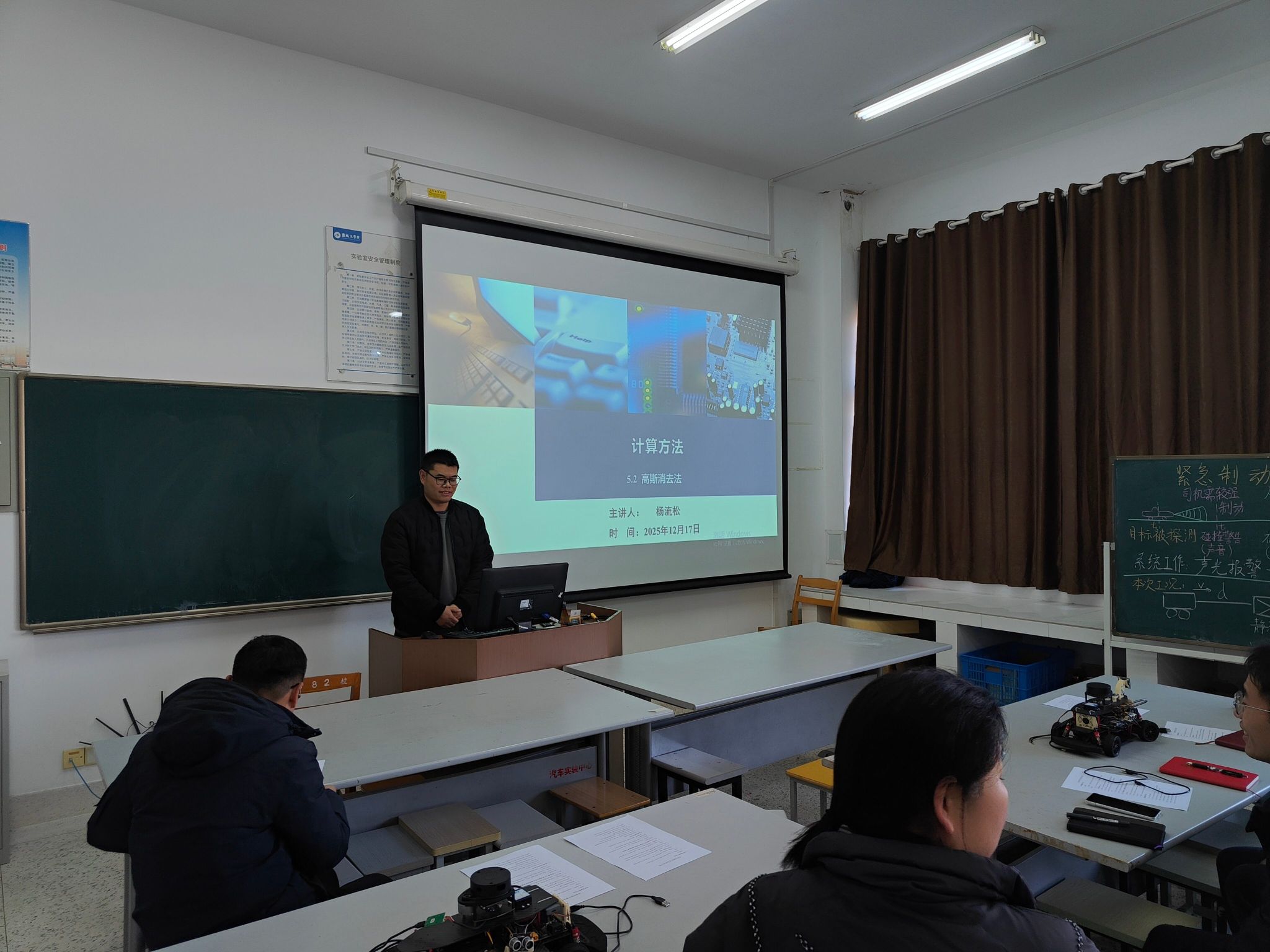 (1)以互相学习、提高教学能力为目的,在专业系内组织教师进行了第二轮教学竞赛。在12月3日第一轮教学竞赛中,侯全会老师首先讲解了汽车制造技术粗基准的选择;之后许丽娟老师介绍了测试技术的幅值调制与解调;再之后夏骅老师讲解了热工学基础的热对流,最后唐杰老师讲解了汽车生产与质量管理的快速换模。在12月17日第二轮教学竞赛中,杨流松老师讲解了计算方法的高斯消去法,朱兵老师讲解了控制工程基础的导论。在两轮教学竞赛中,各位老师相互学习、切磋技艺,促进了思想碰撞与经验共享,互相充分的给予了教学改进意见,形成了浓厚的教学研讨氛围,为提升整体教学质量奠定了坚实基础。