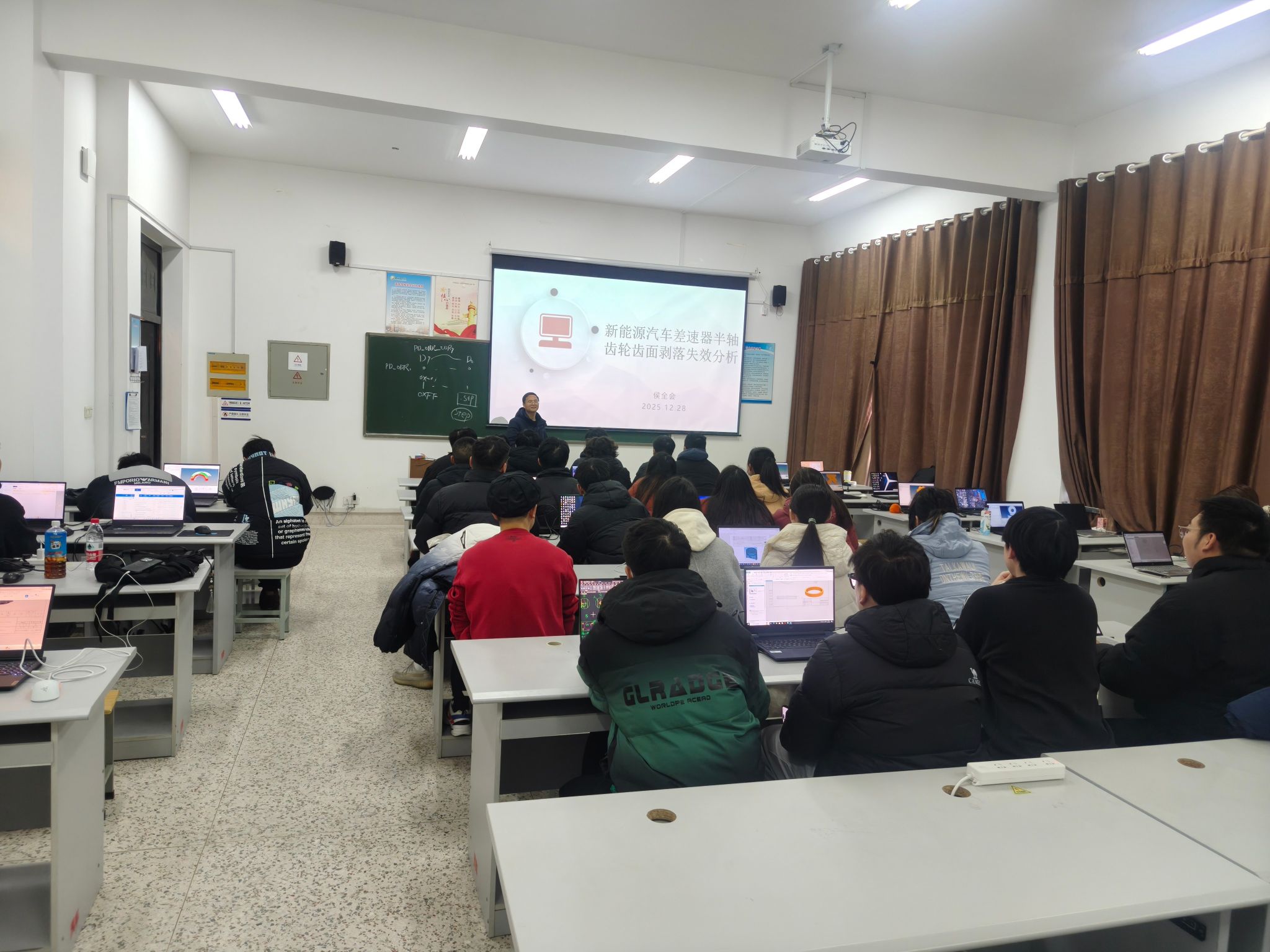 2025年12月28日,由侯全会老师主讲的“新能源汽车差速器半轴齿轮齿面剥落失效分析”报告会在机械馆B413举行,本次报告由郑竹安副院长主持,汽车学院40余名学生参与。本次报告主要面向学生讲解了新能源汽车差速器半轴齿轮齿面剥落失效分析的案例。