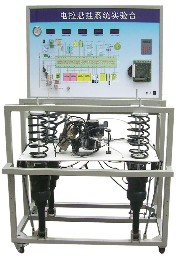 本实验台选用凌志LS400电控气动悬架系统元件,原车结构台架式布置,展板式氧化铝金属面板,万向自锁脚轮台架,便于移动教学。