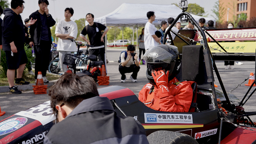 各车队队员聚集在风雨操场观摩我队车手日常练车流程,车手身着专业赛车服,驾驶我队E39方程式赛车在车道上飞驰。各车队相关队员聚集在一起,激情探讨各自在车队遇到的问题、面对的困境,其他同学也都倾囊相授,大方提出自己的见解,讨论解决方法,争取获得问题最优解。同学们交流经验,分享软件、技能,积极从其他车队的优势中找出自己的不足,从而更好地提升自己的实力。