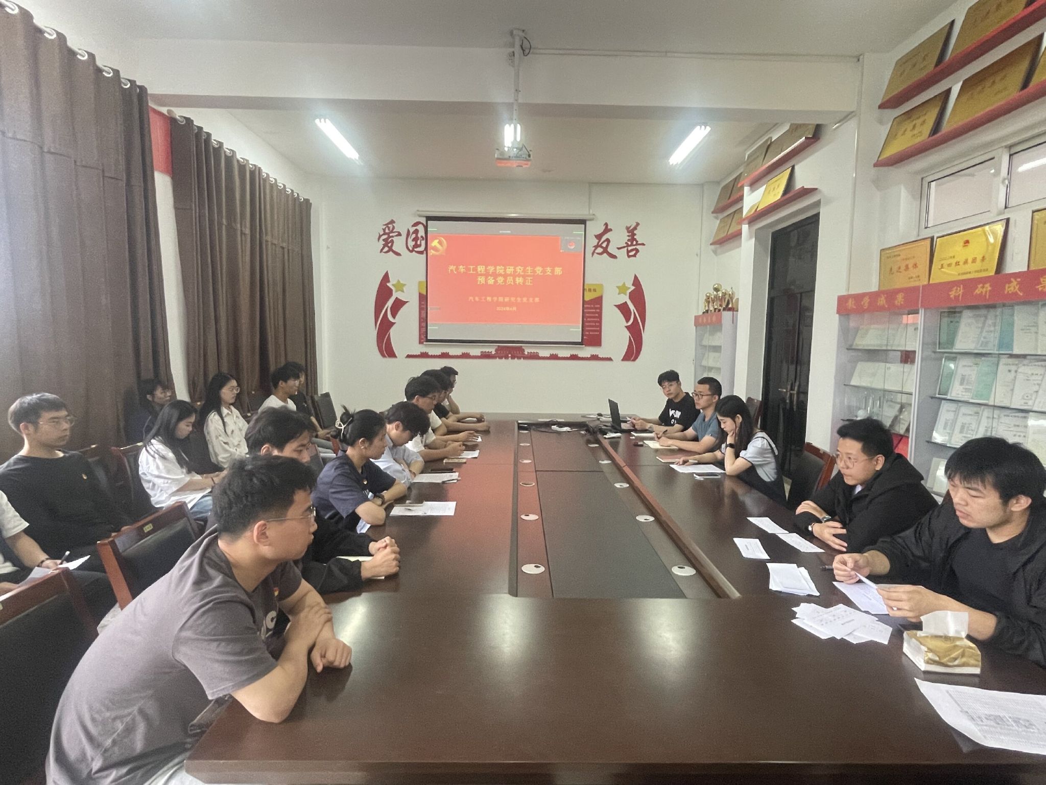 汽车学院研究生党支部于2024年6月5日在机械馆A323会议室召开党员大会讨论预备党员曲中辉、魏金呈、仇泽涛同志的转正事宜,会议由支部宣传委员陈志峰主持。