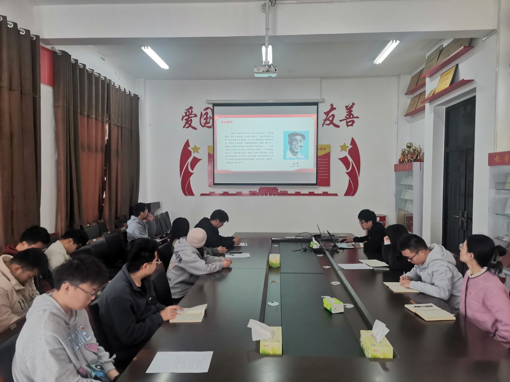 党史故事分享环节中,谢双健表示:孟泰以敬业、创新等精神助力鞍钢。他忠诚企业,勇于担当,无私奉献。孟泰事迹激励众人,研究生也应从中学习,将个人奋斗与国家建设结合,不断拼搏进取实现梦想。吴潇表示:谢秀梅充满爱国精神,其高尚人格包含淡泊宁静。她坚强、担当、奉献,一生体现个人与国家相连。研究生应受激励,从她身上汲取力量,为国家繁荣富强积极贡献自己的力量。
