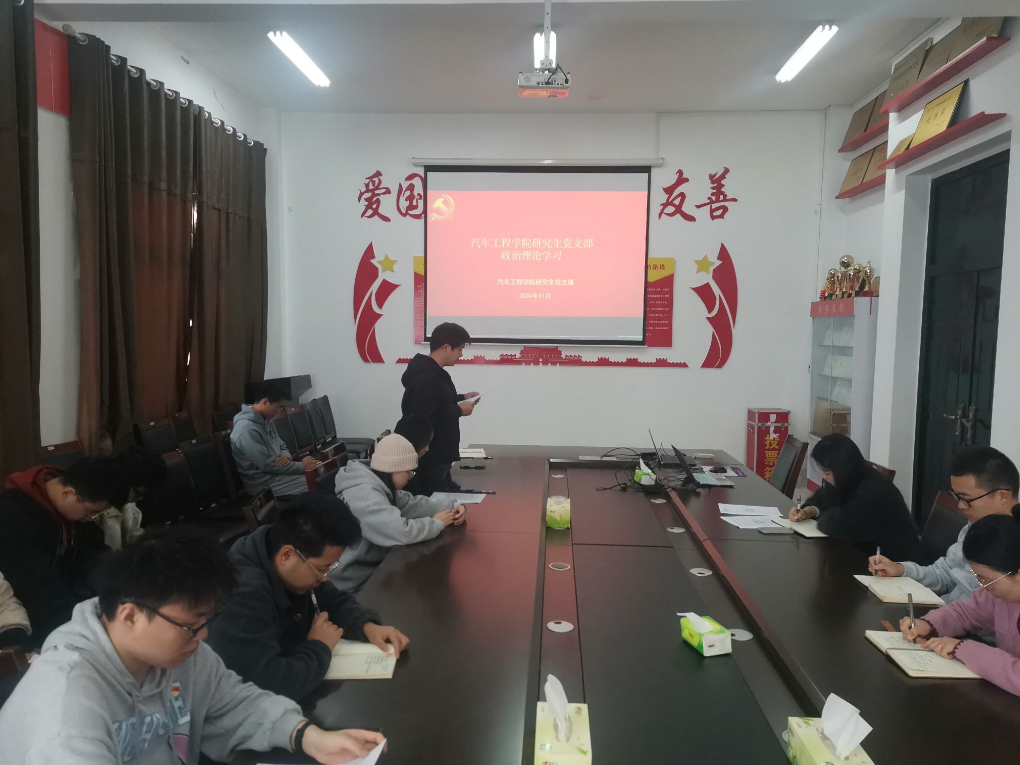 盐城工学院汽车学院研究生党支部于2024年11月6日,在机械馆A323组织召开政治理论学习会议。该会议由陈志峰同志主持,研究生党员同志全体出席参会。