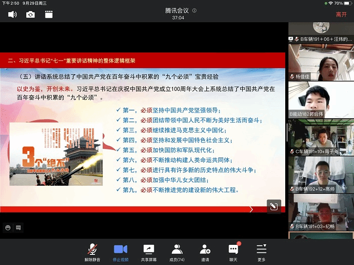 9月29日下午在南校区机械馆A316,院学生党支部开展了学习习近平总书记“七一”重要讲话精神的专题学习。因疫情防控要求,本次学习采取线上线下结合的方式,党支部书记姜华主讲,学生支部共73名党员参加本次学习。