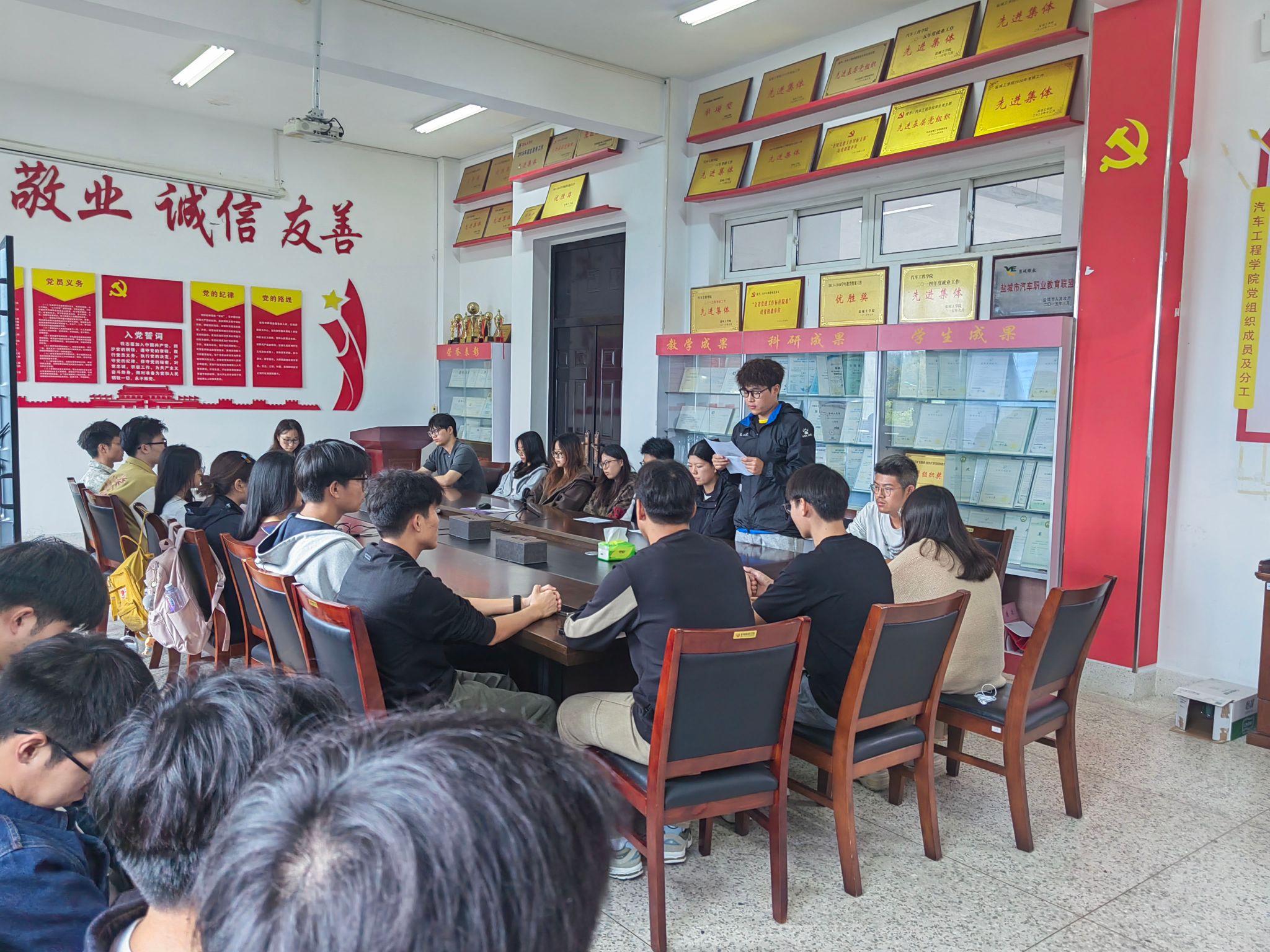 为深刻领会习近平总书记在纪念中国人民抗日战争暨世界反法西斯战争胜利 80 周年大会上的重要讲话精神,引导学生党员从伟大抗战精神中汲取奋进力量,10月17日下午,汽车工程学院学生党支部开展政治理论学习会,集中学习习近平总书记重要讲话精神及《弘扬伟大抗战精神,向着中华民族伟大复兴的光辉彼岸奋勇前进》专题报道,本次学习由支部书记孙雅主持,全体学生党员参加。