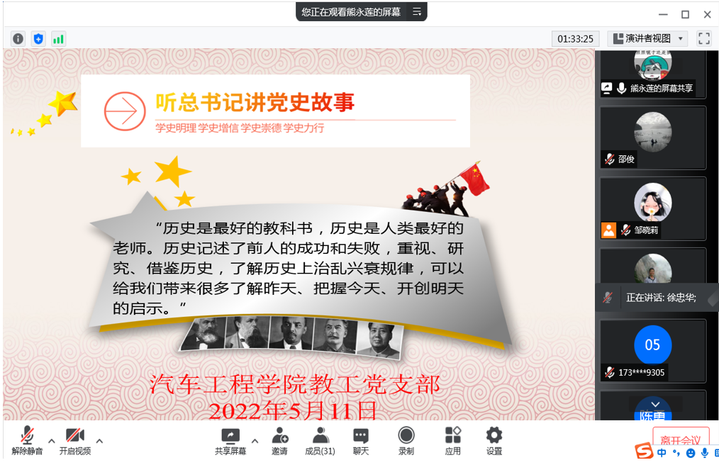“历史是最好的教科书,历史是人类最好的老师。历史记述了前人的成功和失败,重视、研究、借鉴历史,了解历史上治乱兴衰规律,可以给我们带来很多了解昨天、把握今天、开创明天的启示。”党的十八大以来,习近平总书记多次到访红色圣地,缅怀革命英烈,讲述红色故事。为重温总书记讲述的党史故事,从中汲取前进的智慧和力量,5月11日下午,汽车工程学院教工党支部通过腾讯会议开展“听总书记讲党史故事”学习教育活动。会议由教工支部书记熊永莲“线上”主持,学院全体教工党员“线上”参会。