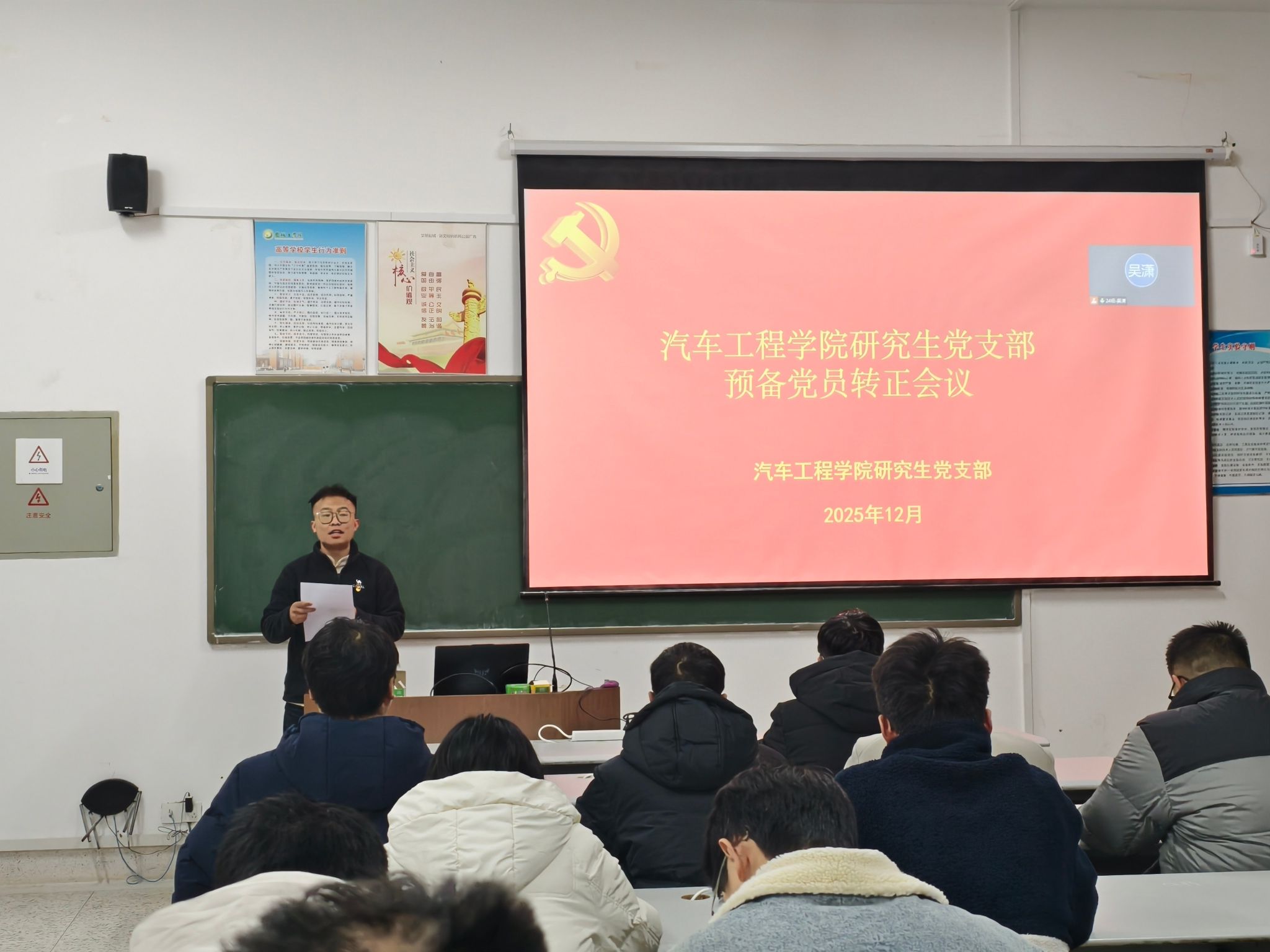 2025年12月12日于机械馆B413会议室,汽车学院研究生党支部召开党员大会讨论预备党员汪金辉同志的转正事宜。