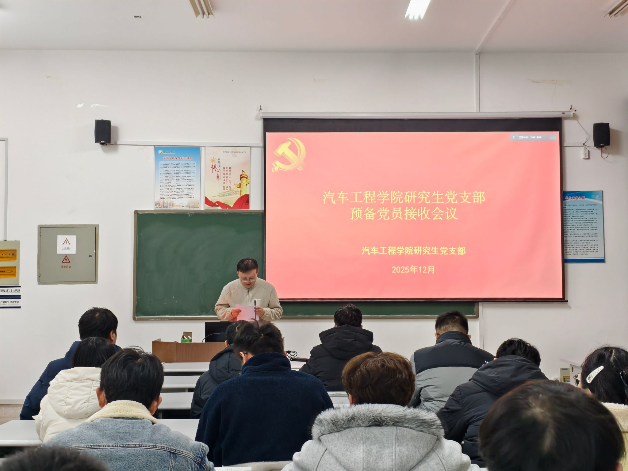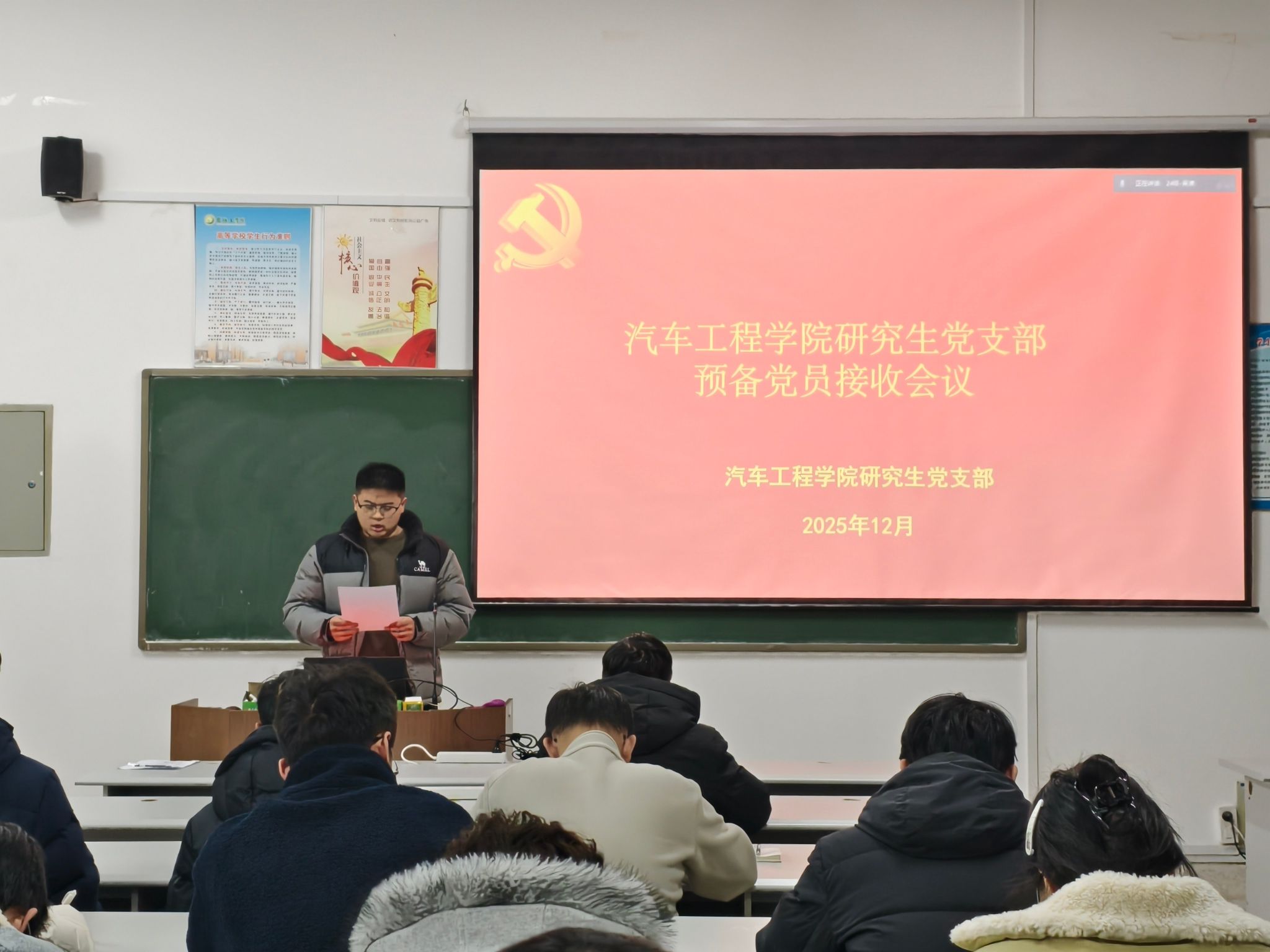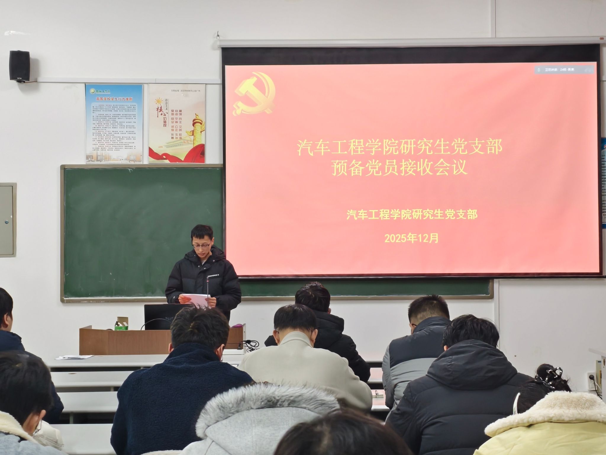 2025年12月12日在机械馆B413会议室,汽车学院研究生党支部召开党员大会,讨论预备党员接收的议题,会议由吴潇主持,支部全体党员参加。