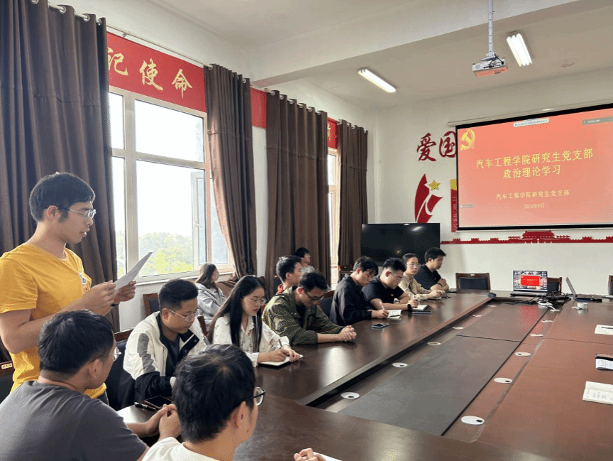 盐城工学院汽车学院研究生党支部于2023年9月27日,在机械馆A323组织了汽车学院研究生党支部政治理论学习。该会议由范景森老师主持,研究生党员同志全体出席参会。