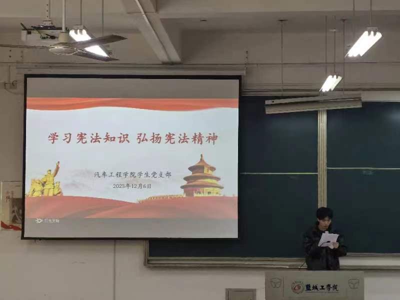 2023年12月4日是第十个国家宪法日,也是我国现行宪法公布施行40周年。为大力弘扬宪法精神,维护宪法权威,扎实推进法治文化建设,提升学院学生崇尚宪法、遵守宪法、运用宪法的能力和意识,汽车学院学生党支部以“学习宪法知识 弘扬宪法精神”为主题,于12月6日在博学楼D115组织支部政治理论学习。