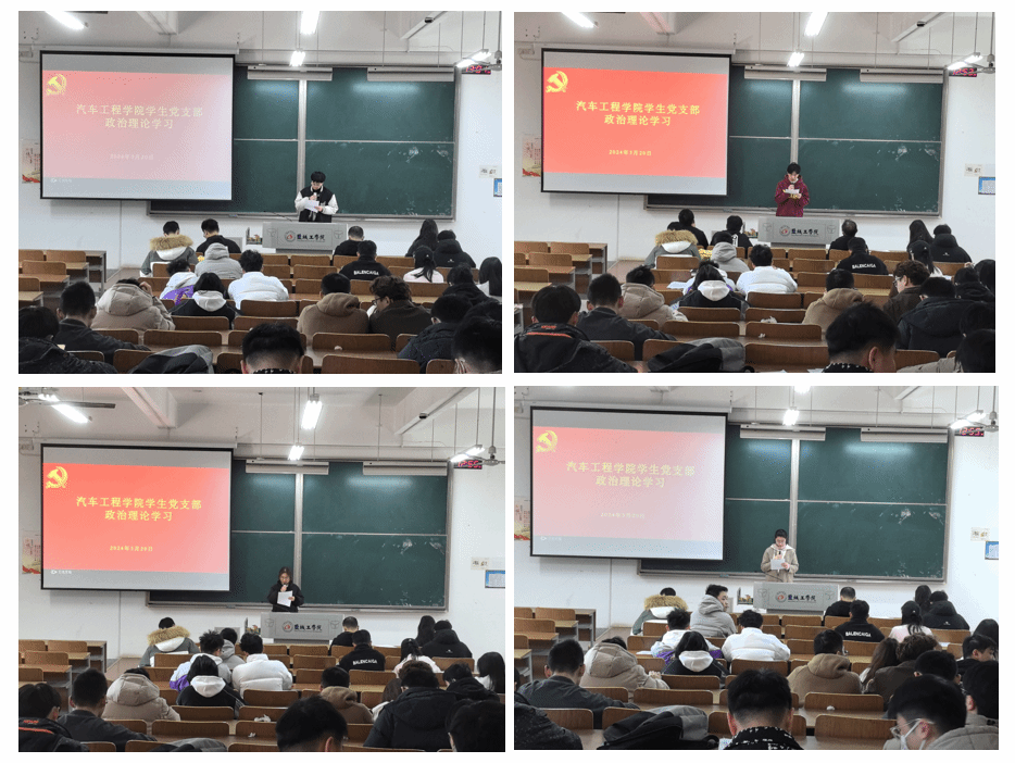 3月20日中午,汽车工程学院学生党支部在南校区博学楼D117组织三月支部政治理论学习,主要学习习近平总书记在中共中央政治局第十一次集体学习时的重要讲话精神及《习近平新时代中国特色社会主义思想学习论丛》第六辑至第十辑内容,本次学习由支部书记孙进主持,全体学生党员参加。