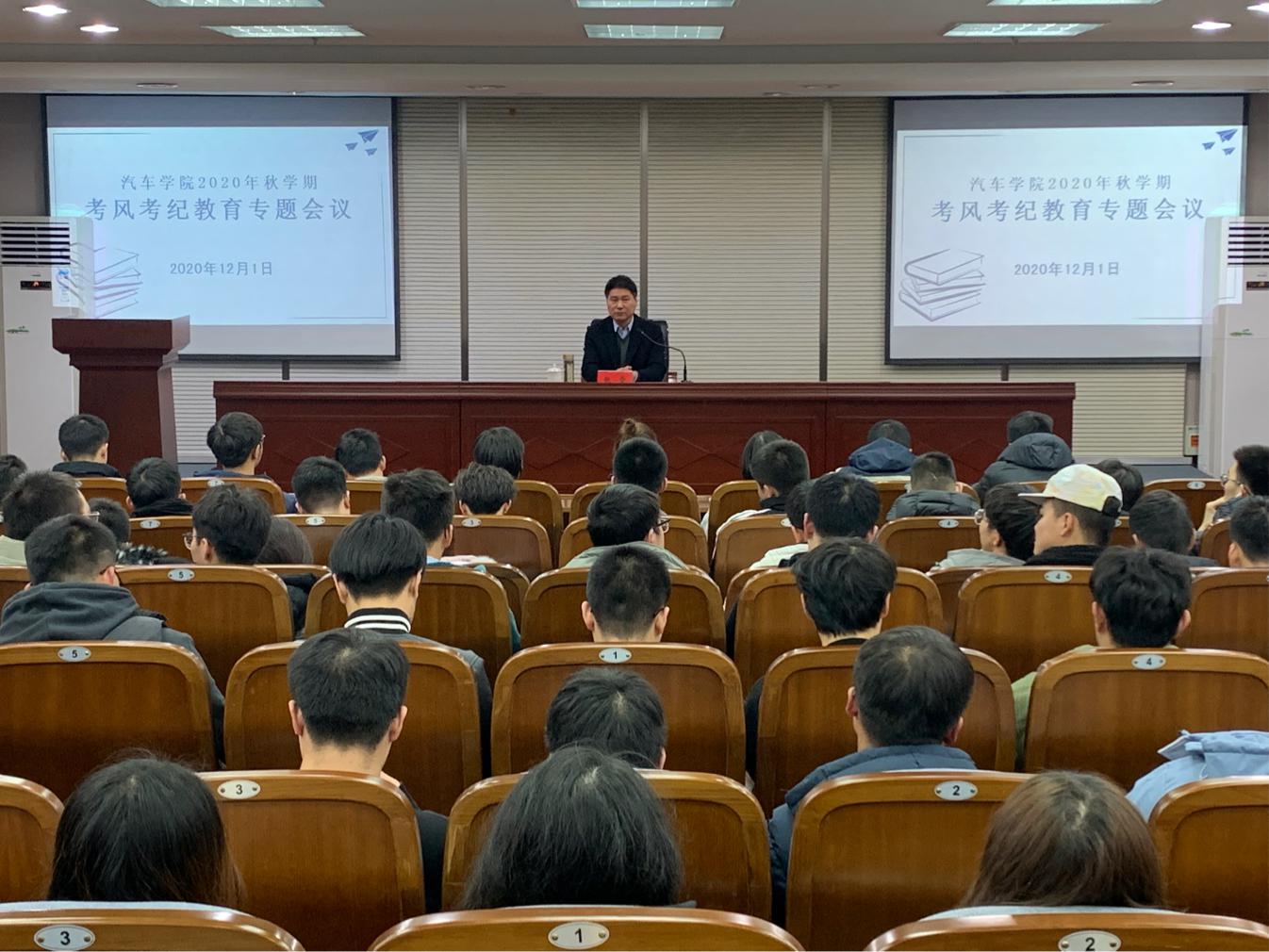 12月1日晚,在图书馆五楼报告厅,学院党总支书记张雷做考风考纪教育专题教育,辅导员刘基冈、陈勇,2018级专转本、“3+2”五个班全体同学参加。