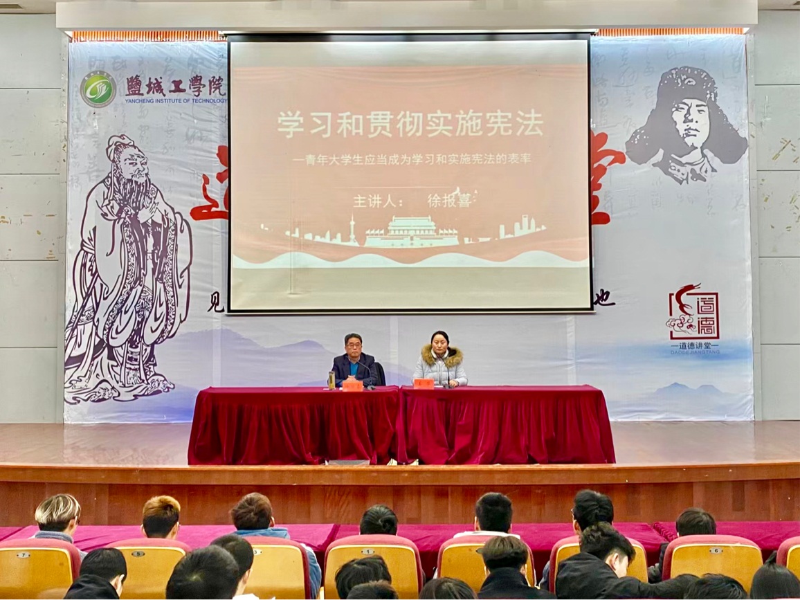 12月2日下午,在南校区五四报告厅,校关工委副主任徐报喜教授应邀为汽车工程学院学生做学习和贯彻实施宪法专题报告会。汽车工程学院党总支副书记姜华主持,2018级全体学生参加。