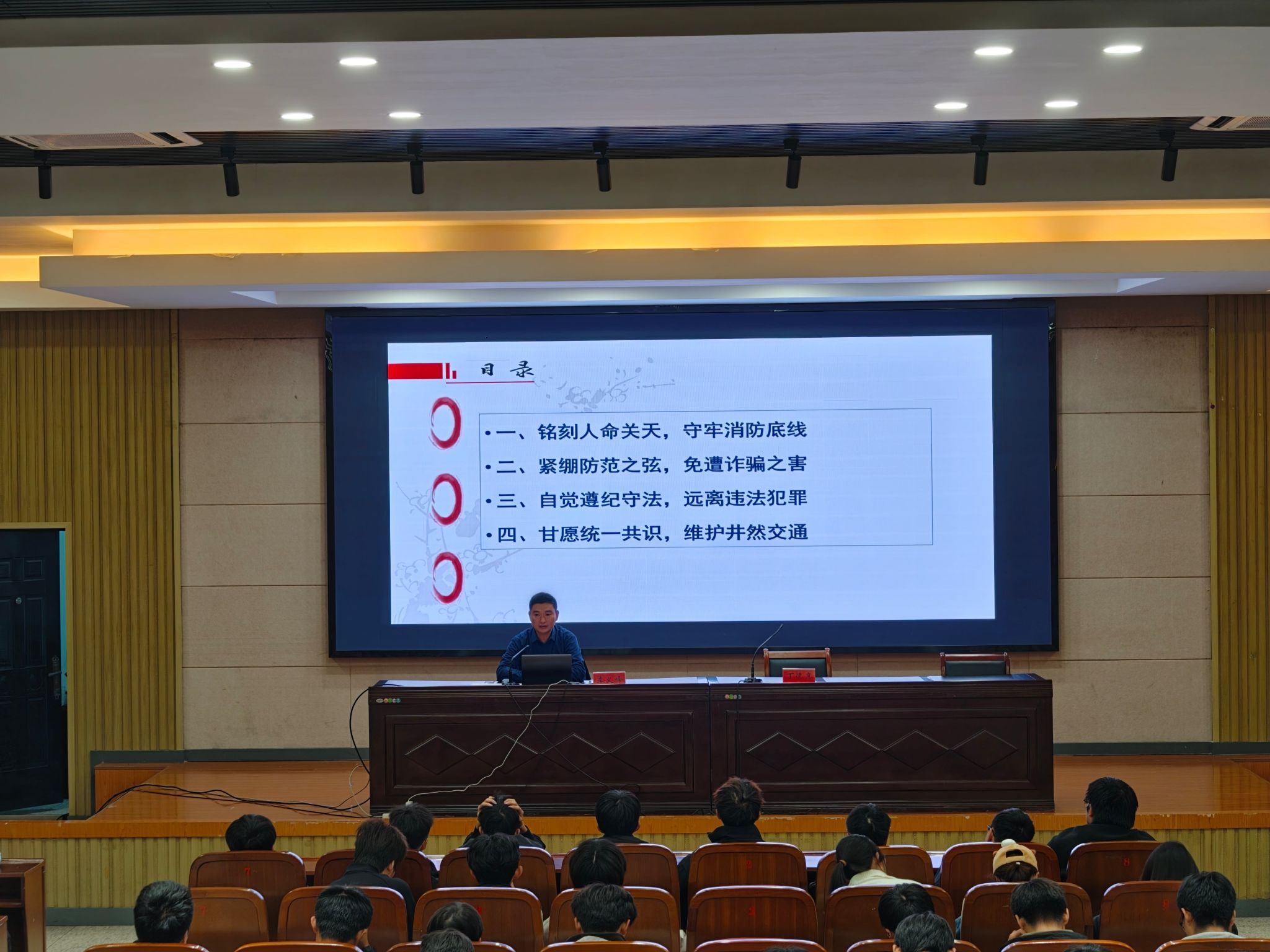 讲座中,李义峰介绍了“铭刻人命关天,牢守消防底线”“紧绷防范之弦,免遭诈骗之害”“自觉遵纪守法,远离违法犯罪”“甘愿统一共识,维护井然交通”四个方面内容,强调了消防安全的重要性并播放电瓶车或大功率电器使用不当引发火灾的视频;强调了增强反诈骗的重要性并结合我校师生遭受电信诈骗事件提醒学生文明安全用网;强调了遵守法律法规的重要性并要求学生远离违法犯罪;强调了遵守交通安全规定的重要性并提醒学生校内遵守电瓶车、自行车的驾驶、摆放要求。