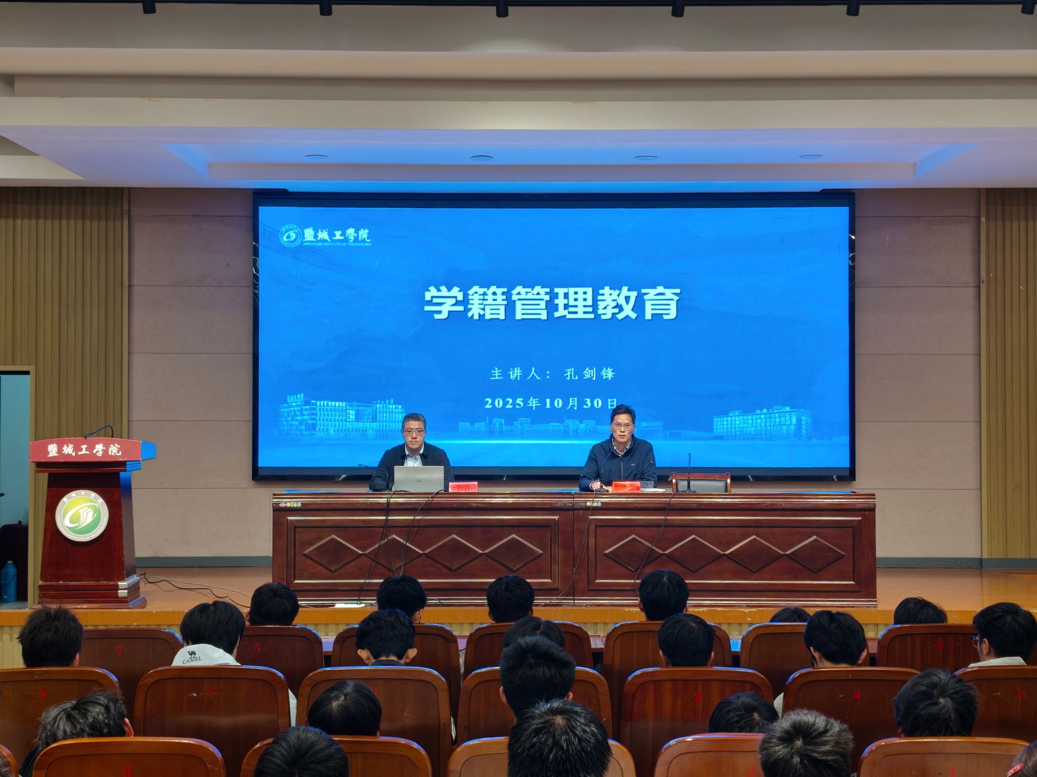 为引导2025级新生快速适应大学生活,增进对学籍管理规定的了解,合理规划学业发展路径,10月30日下午,汽车工程学院在南校区机械馆报告厅举办2025级新生学籍管理教育讲座,教务处副处长、教师发展中心副主任孔剑锋主讲,学院党总支副书记丁德惠主持,新生辅导员及2025级全体新生参加。
