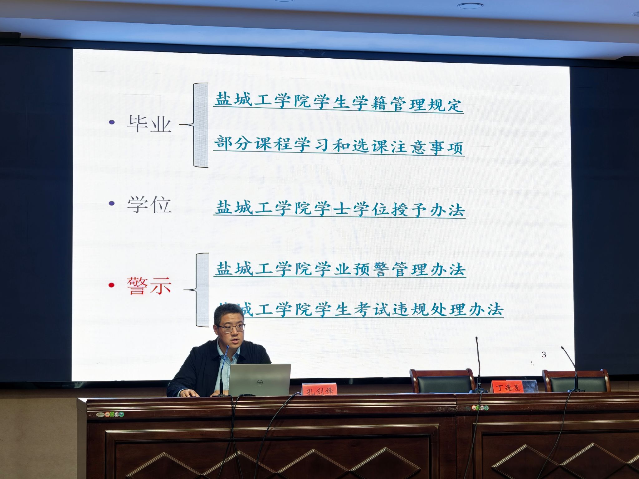 孔剑锋首先强调了学籍管理的重要意义,详细解读了学籍注册、休学复学、学业预警、毕业结业等规定,着重强调了学生成绩管理与绩点计算、毕业、学位授予等方面的要求,引导学生要学透把准学籍管理规定,科学合理制订个人学业及职业生涯规划,珍惜大学时光,积极投入学习,练就过硬本领,成就未来人生。