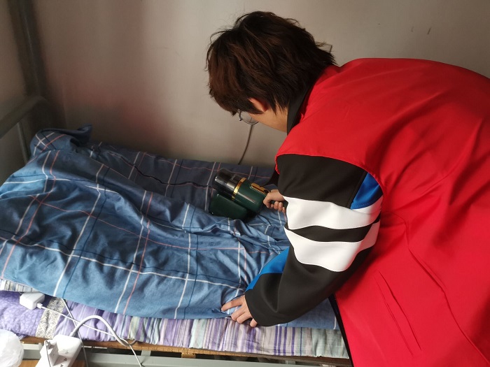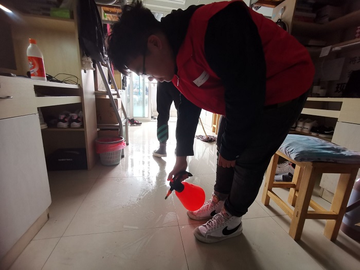 针对春季流行疾病多发,志愿者对宿舍进行了消毒;大四毕业年级同学在外实习床铺长时间未晾晒,志愿者们细心地用手持充电式除螨仪给这些床铺一一除螨消毒;对大一年级的同学们,志愿者们详细宣传了怎么有效预防春季传染性疾病,并动手协助大一同学们清洁卫生、整理物品。