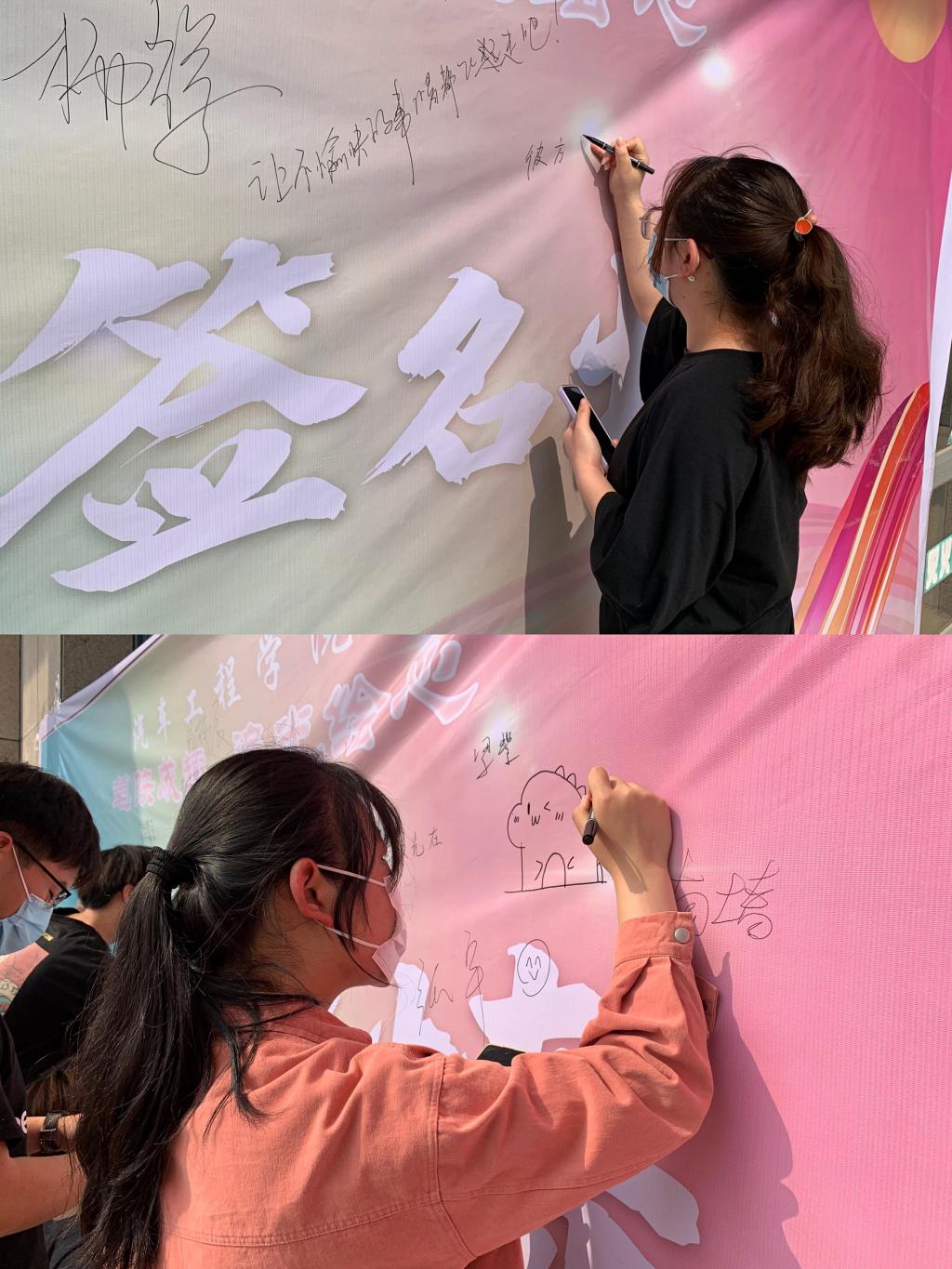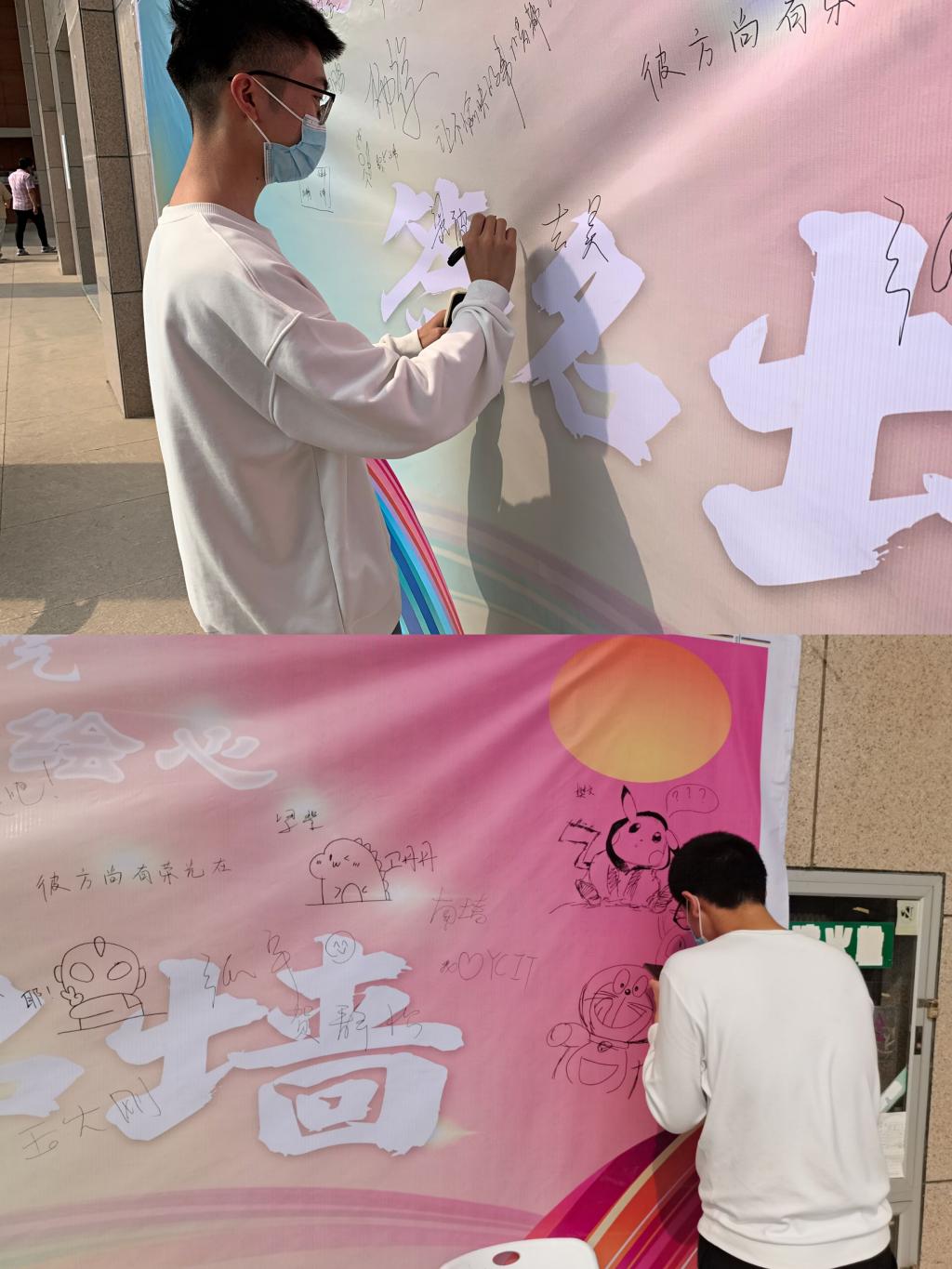 活动一经发出,便得到了同学们的积极响应。全院两百多名学生拿起画笔参与到本次涂鸦当中。活动期间,同学们不仅展现了高超的绘画设计水平,还在作品中展现了积极昂扬的大学生心理素养。涂鸦作品中不仅有对个人美好生活的期待,还有对同班好友真切的鼓励,对学校社会由衷的祝福,营造了“同心共济、向阳生长”的良好氛围。