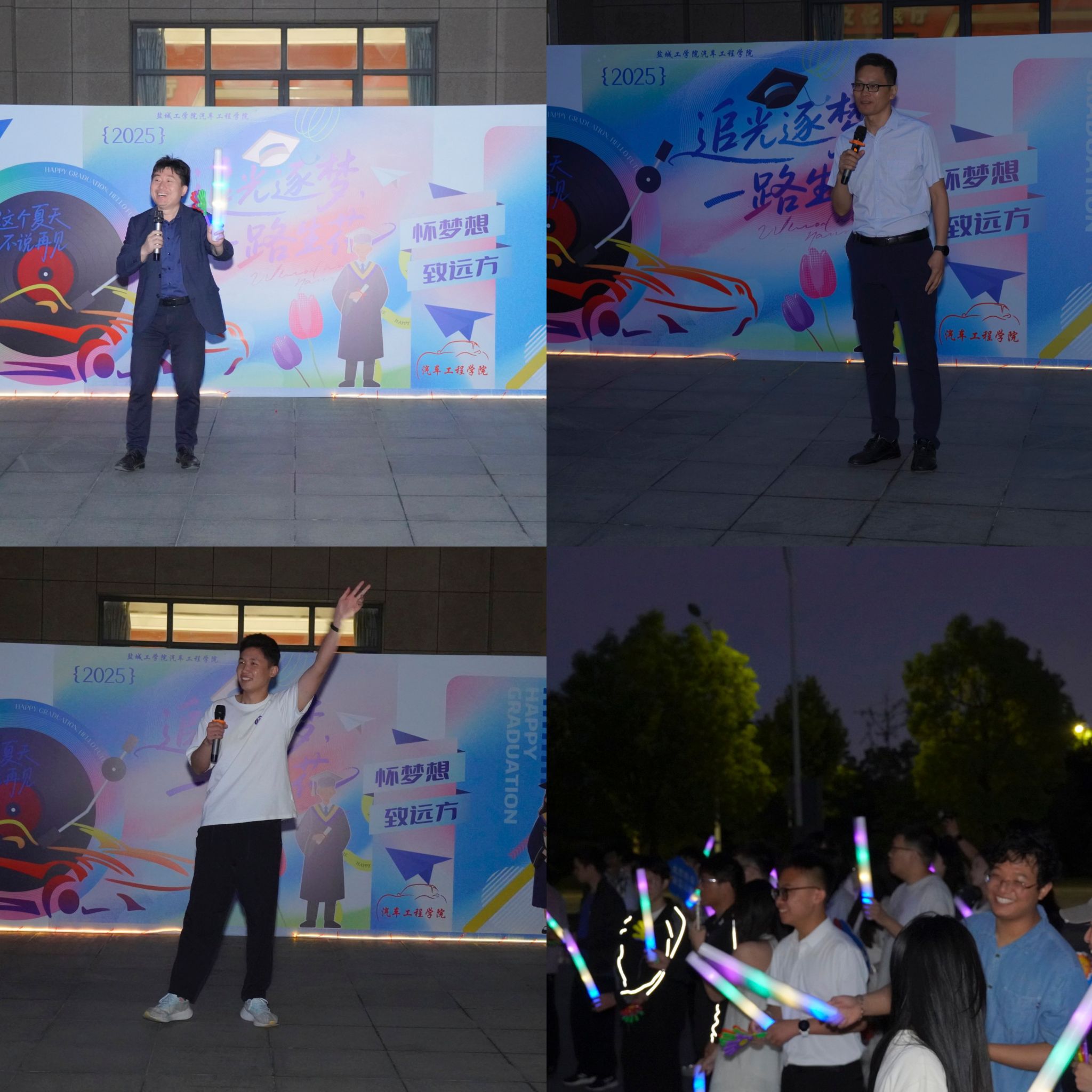 6月12日晚,一场属于毕业生的音乐盛宴——“追光逐梦·一路生花”毕业生歌友会在机械馆一楼西侧广场激情唱响。学院副院长郑竹安、党总支副书记丁德惠及毕业班辅导员为毕业生们送上暖心祝福。褪去课堂的严谨,舞台成为毕业生们挥洒青春活力的主场。他们或深情演绎,诉说大学时光的点滴感动与不舍;或引吭高歌,表达对未来的无限憧憬与豪情;更有师生同台献艺,默契配合间流淌着浓浓的师生情谊。熟悉的旋律引发全场共鸣,掌声、欢呼声、跟唱声汇成一片欢乐的海洋。这场特别的歌友会,不仅是一场视听享受,更是一次情感的集体释放,用音乐的纽带将毕业生们的心紧紧相连,为他们的大学时光画上一个激情澎湃、充满温度的休止符。