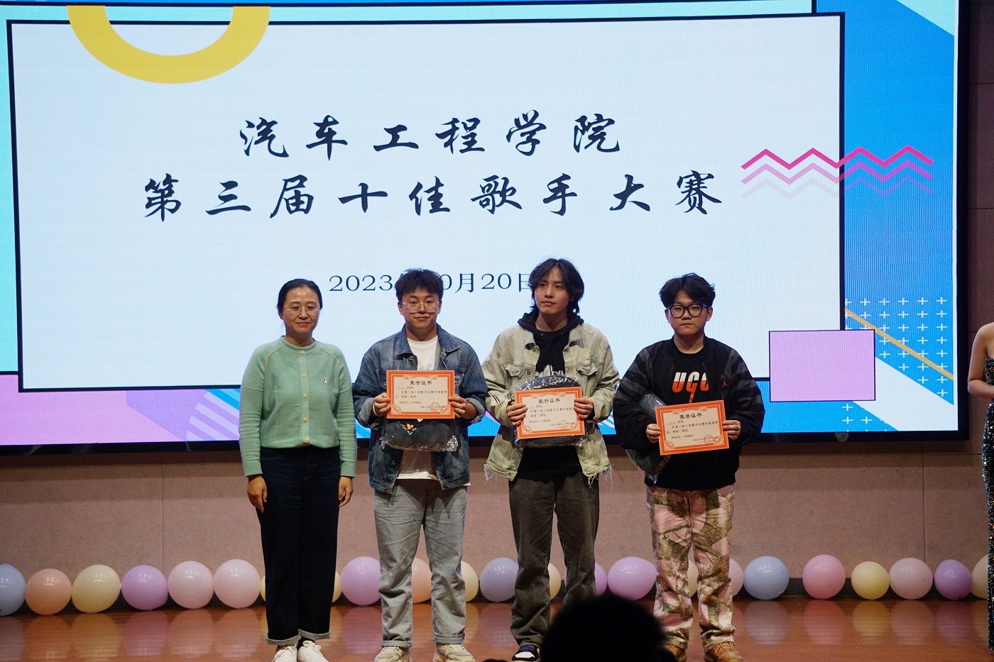 在白热化的角逐中,进入第二轮的十名选手火力全开,在舞台上尽情地展示自我,用动人的歌声和出色的舞台表现为现场观众带来一场视听盛宴。最终,经过激烈角逐,龚咏忆同学脱颖而出,荣获本次汽车工程学院十佳歌手冠军,许泽和杨家豪同学获得亚军和季军。