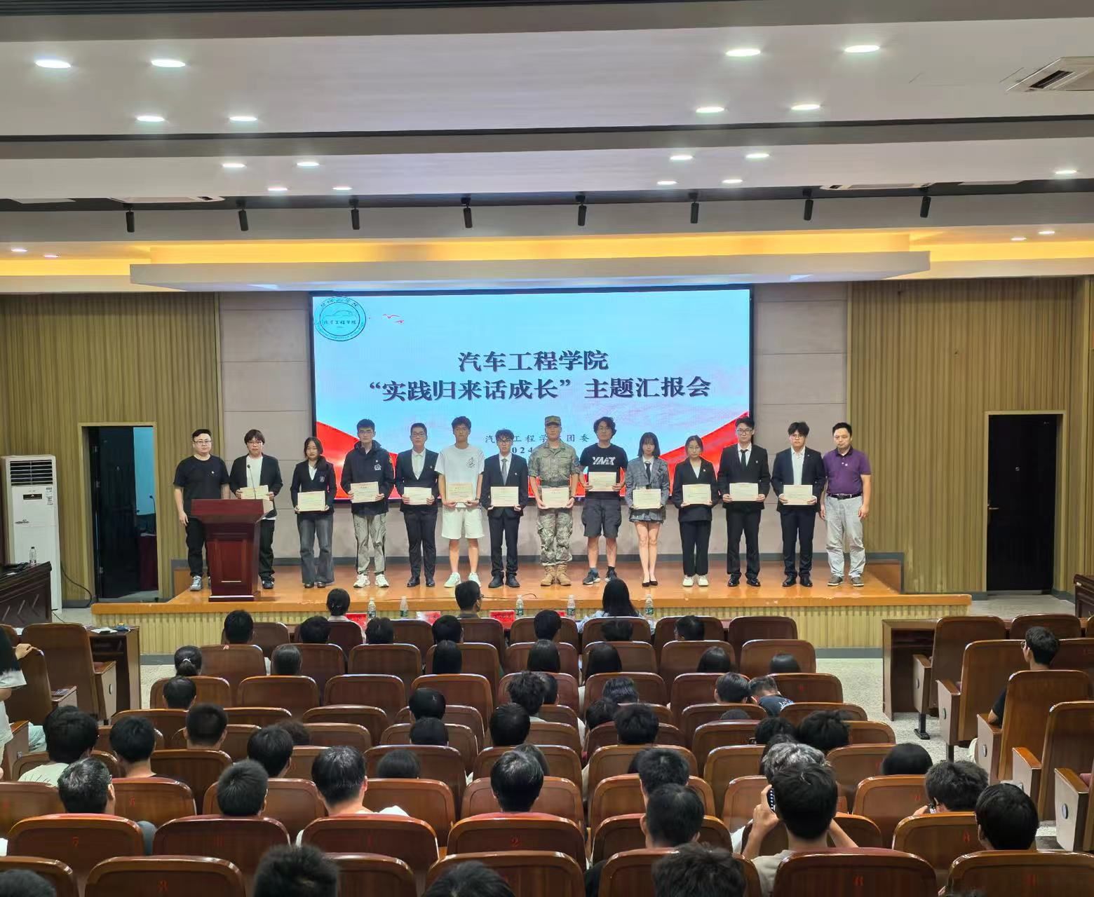 为充分展示暑期社会实践优秀成果,引导青年大学生知行合一、开拓奋进,9月20日晚汽车工程学院在南校区机械馆报告厅举行“信仰公开课”系列教育之2024年“实践归来话成长”暑期社会实践成果汇报会。学院党总支副书记丁德惠、学工办主任吴慰春、团委副书记孙进及全体辅导员出席,2024级新生及大二、大三年级学生代表等200余人参加。