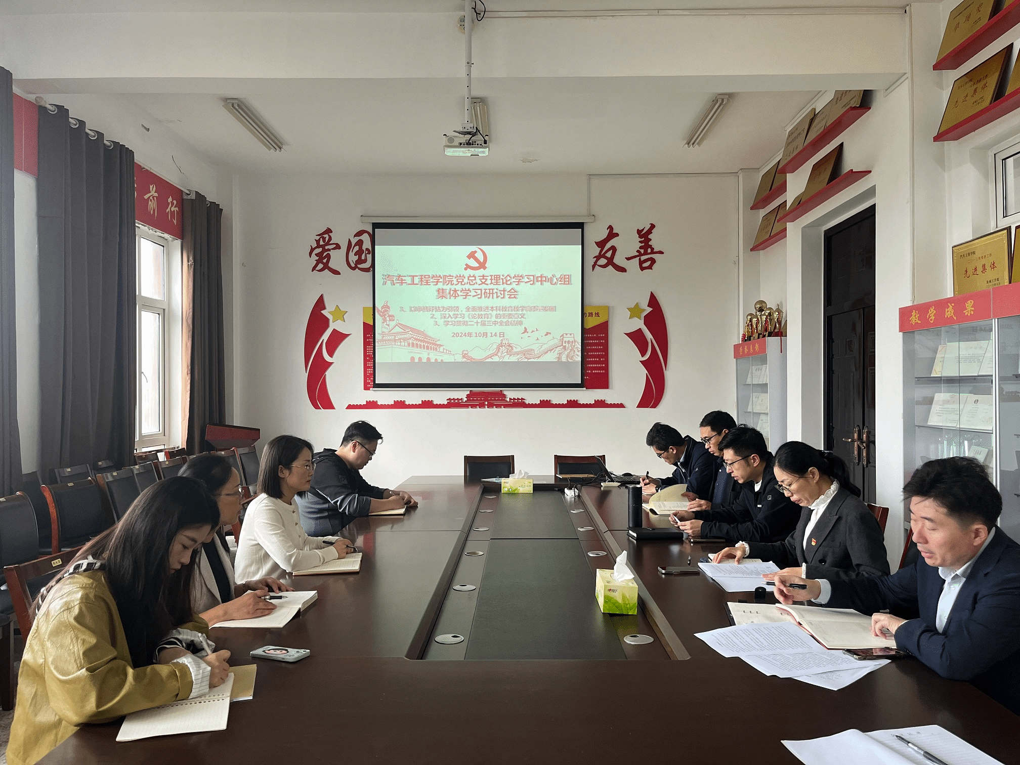 10月14日上午,汽车工程学院党总支理论学习中心组在机械馆A323会议室举行集体学习研讨会,学习研讨如何以审核评估为引领,全面推进本科教育教学高质量发展、深入学习《论教育》的重要意义以及如何做好二十届三中全会精神的学习宣传贯彻,推动全会精神落地见效。学院党总支书记陈青主持,理论学习中心组全体成员参加。