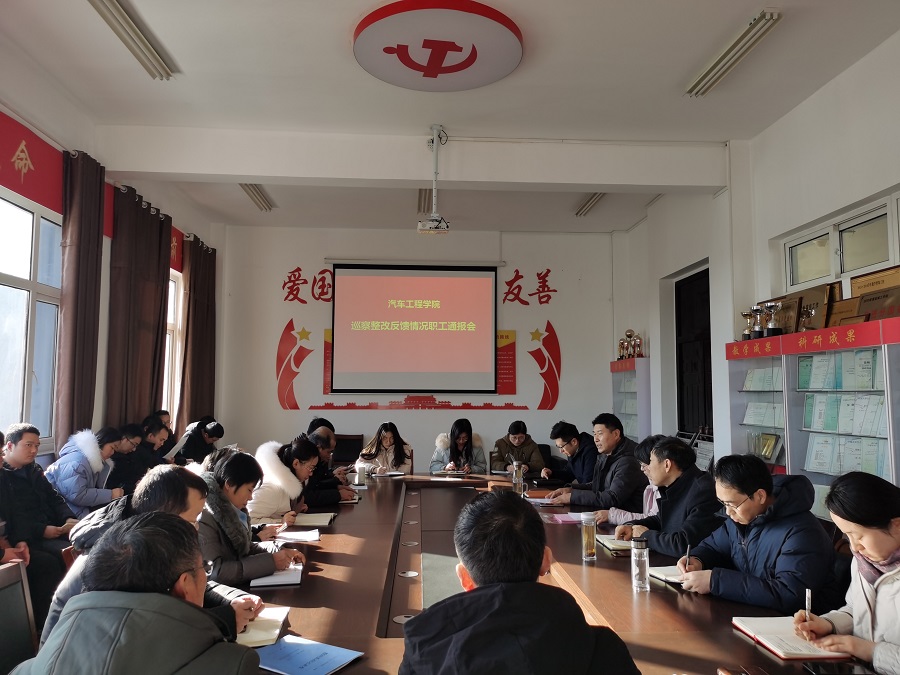 12月30日下午,汽车工程学院在机械馆A323会议室召开巡察整改情况通报会。会议由学院党总支书记张雷主持,校纪委吴雪梅科长和学院教职工参加会议。