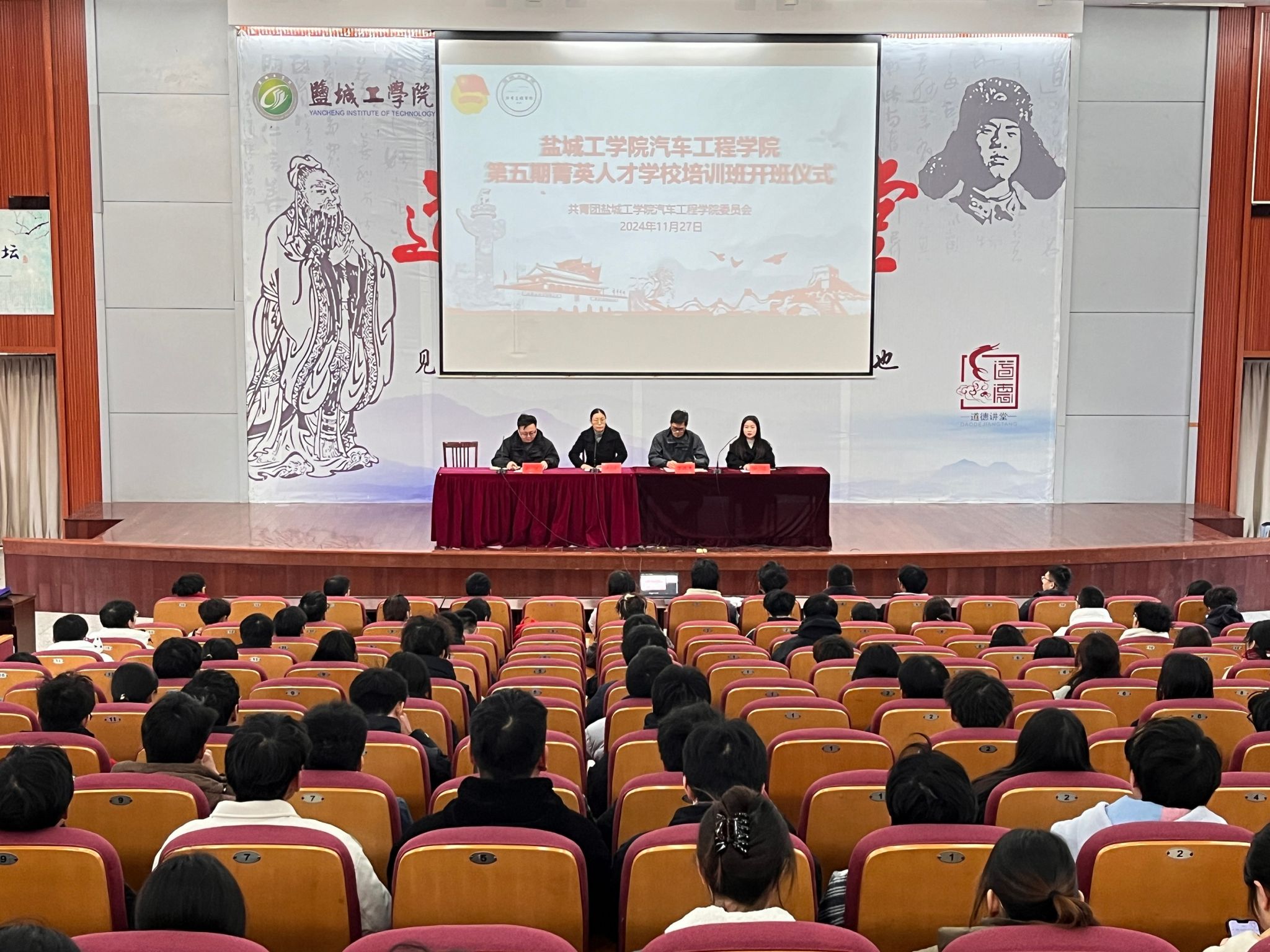 11月27日下午,汽车工程学院在博学楼五四报告厅举办2024年学院菁英人才学校培训班开班仪式暨首场公开课。学院党总支书记陈青、副书记丁德惠、学工办主任孙进出席,院团委副书记姚源主持,学院菁英班全体学员参加。