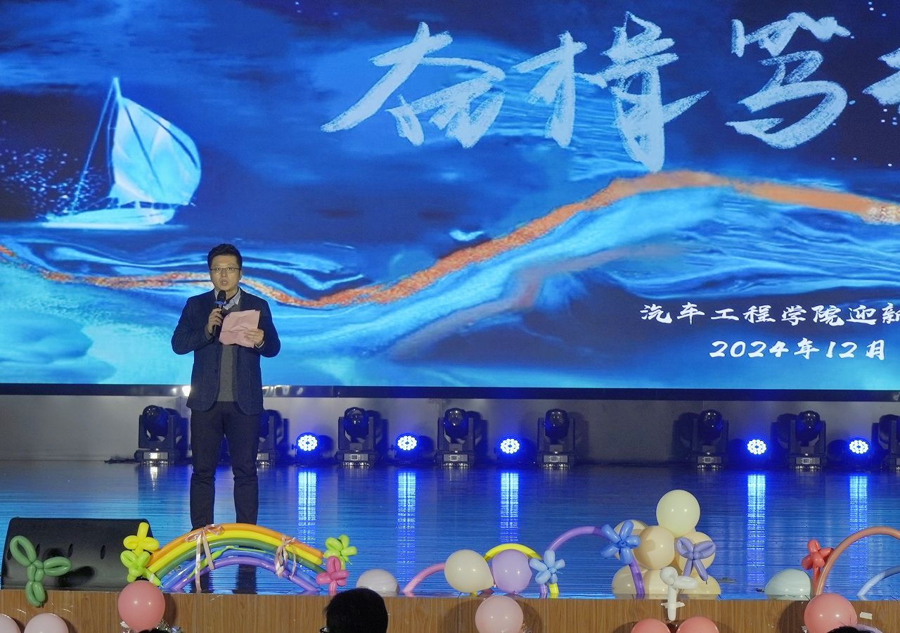 为欢迎2024级学生、迎接新年,展示汽车工程学院师生风采与活力,12月26日晚汽车工程学院在希望大道校区行政楼报告厅举办2024年“以汽之名,奋楫笃行”迎新晚会。汽车工程学院院长刘玮、党总支书记陈青、副院长郑竹安、副书记丁德惠、教师代表、全体辅导员及2024级新生300余人参加。