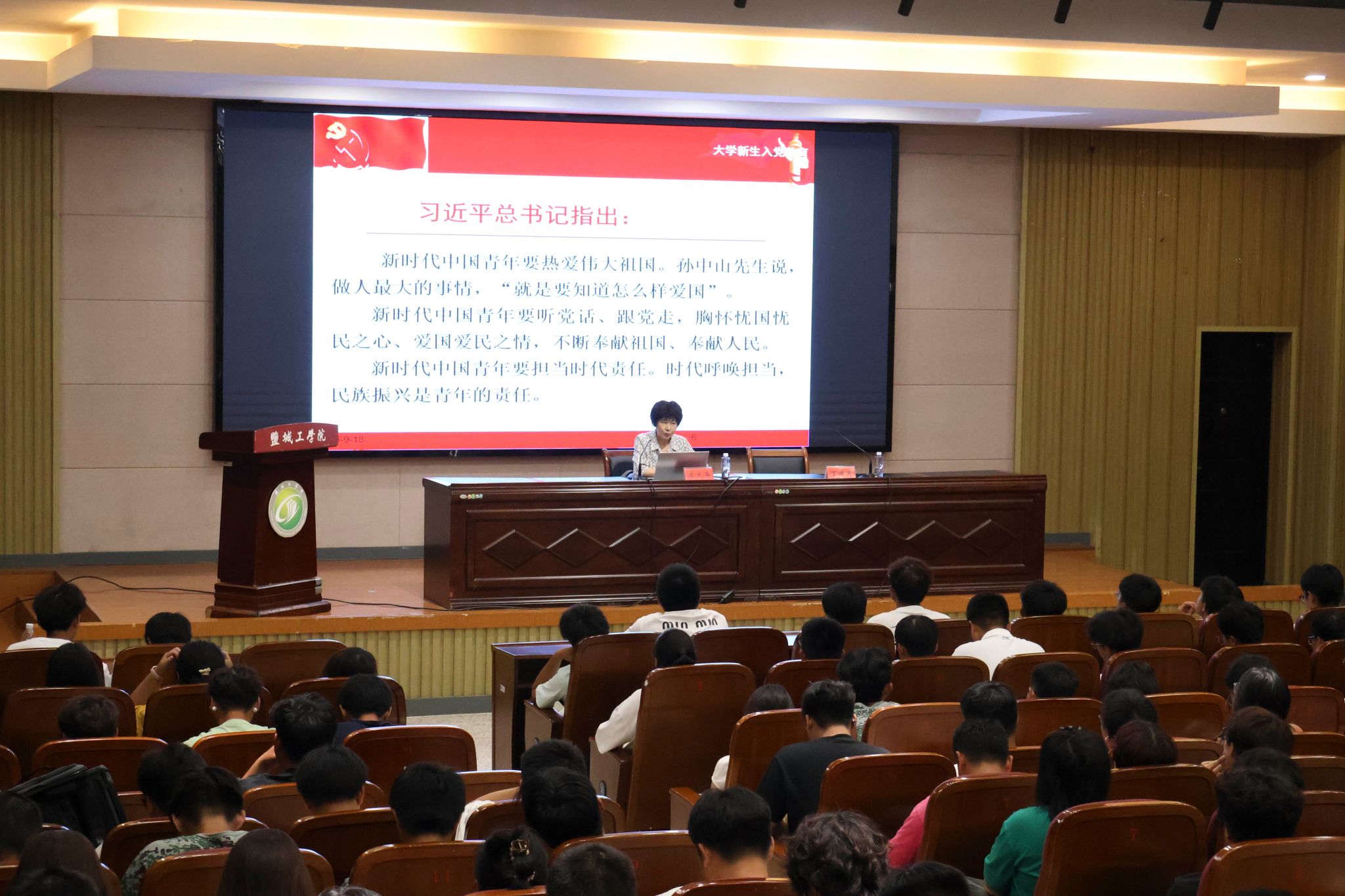 朱龙英围绕“坚定理想信念”“熟知党的知识”“明确入党流程”三个部分展开讲授。首先,她以党的百年奋斗历程为主线,从嘉兴南湖红船启航,到新时代全面建设社会主义现代化国家的宏伟实践,生动讲述一代代共产党人坚守信仰的故事,引导学生将个人理想融入国家发展。随后,她系统阐释党的性质、宗旨与组织原则等基础知识,并结合盐城工学院党建工作实际,介绍基层党组织在思想引领和服务师生中的作用。最后,她详细说明从递交申请到成为正式党员的各个环节,强调培养考察阶段的要求,鼓励新生积极投身社会实践,以实际行动向党组织靠拢。丁德惠在总结中勉励同学们坚定信念、提升能力、服务社会。