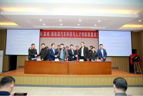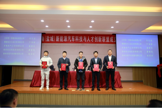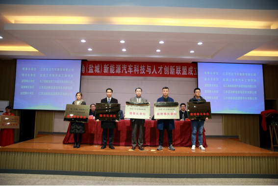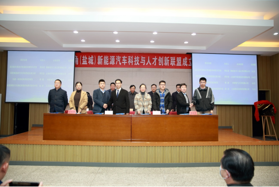 王路明和邓既明共同为长三角(盐城)新能源汽车科技与人才创新联盟揭牌。主席台嘉宾向理事长单位、秘书长单位和8家副理事长单位授牌,向5名联盟产业教授颁发聘书。8家成员单位与我校现场签约了4项产学研合作项目和4项人才培养项目。