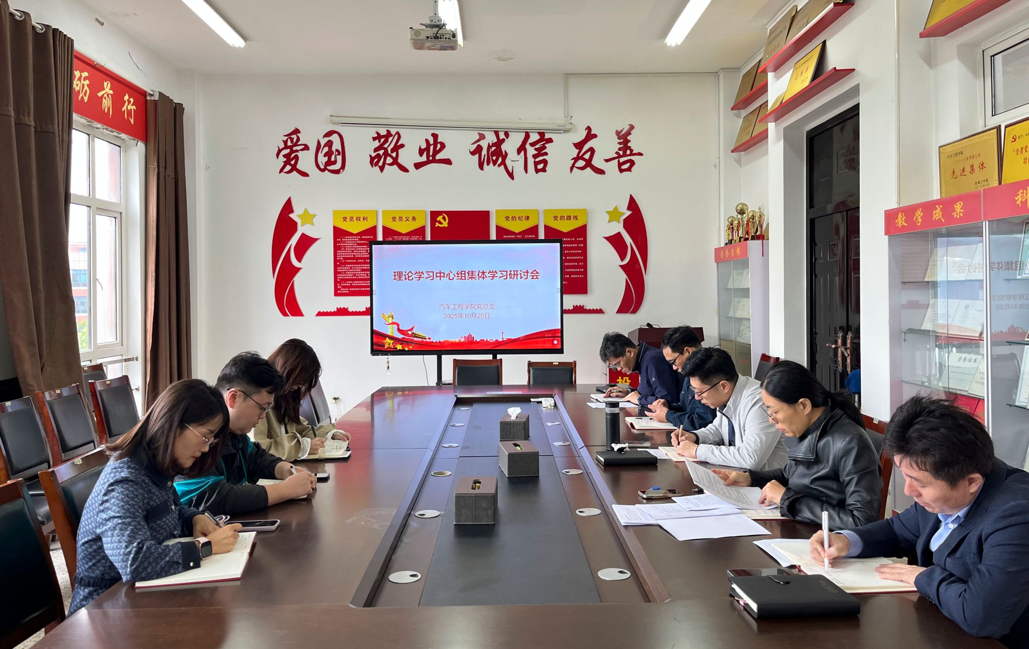 10月20日上午,汽车工程学院党总支理论学习中心组在机械馆A323会议室举行2025年秋学期第二次集体学习研讨会,学习习近平总书记在纪念中国人民抗日战争暨世界反法西斯战争胜利80周年大会上的重要讲话精神、习近平总书记重要文章《健全全面从严治党体系》,党总支书记陈青主持,党总支理论学习中心成员参加。
