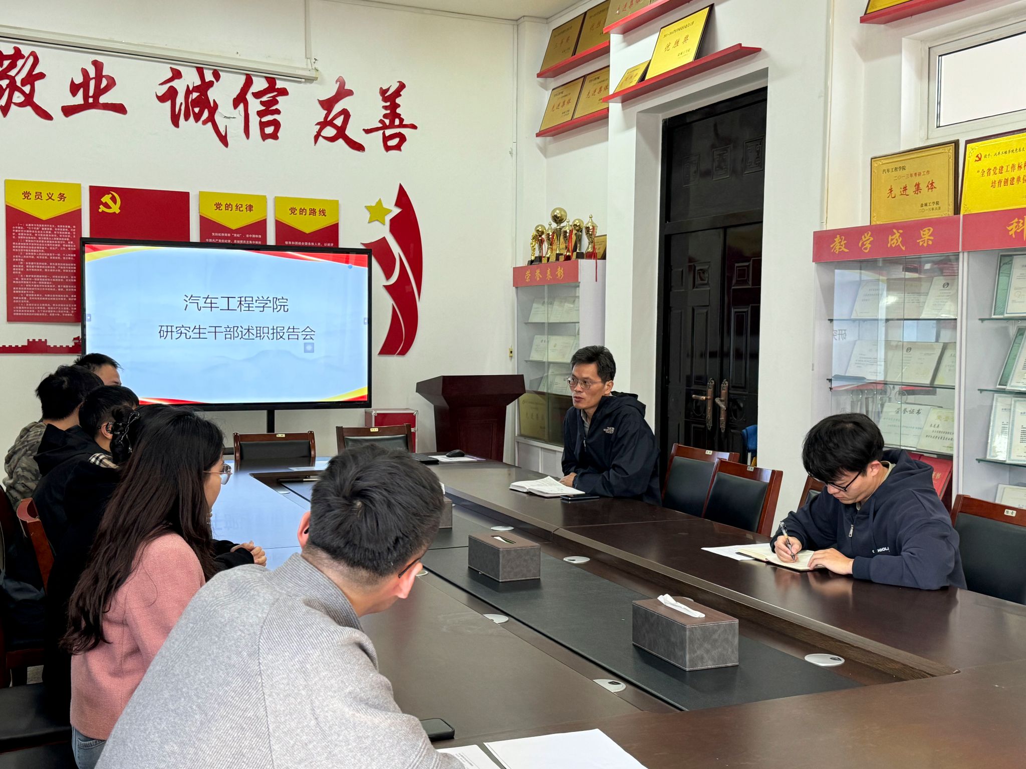 研二、研三各班班长与团支书紧随其后,聚焦班级学风建设、日常管理、困难学生帮扶等核心工作展开述职。有的班长提到,提升班级同学的科研积极性是重中之重,但是文体活动也需要稳步跟进;有的团支书则分享了组织团日活动、学习党日任务等活动的心得,强调通过不断巩固才能深知新时代的要求。同时,大家也针对班级管理中存在的 “部分学生参与度不高”“跨年级交流较少” 等问题,提出了加强沟通机制、搭建交流平台等解决方案。
