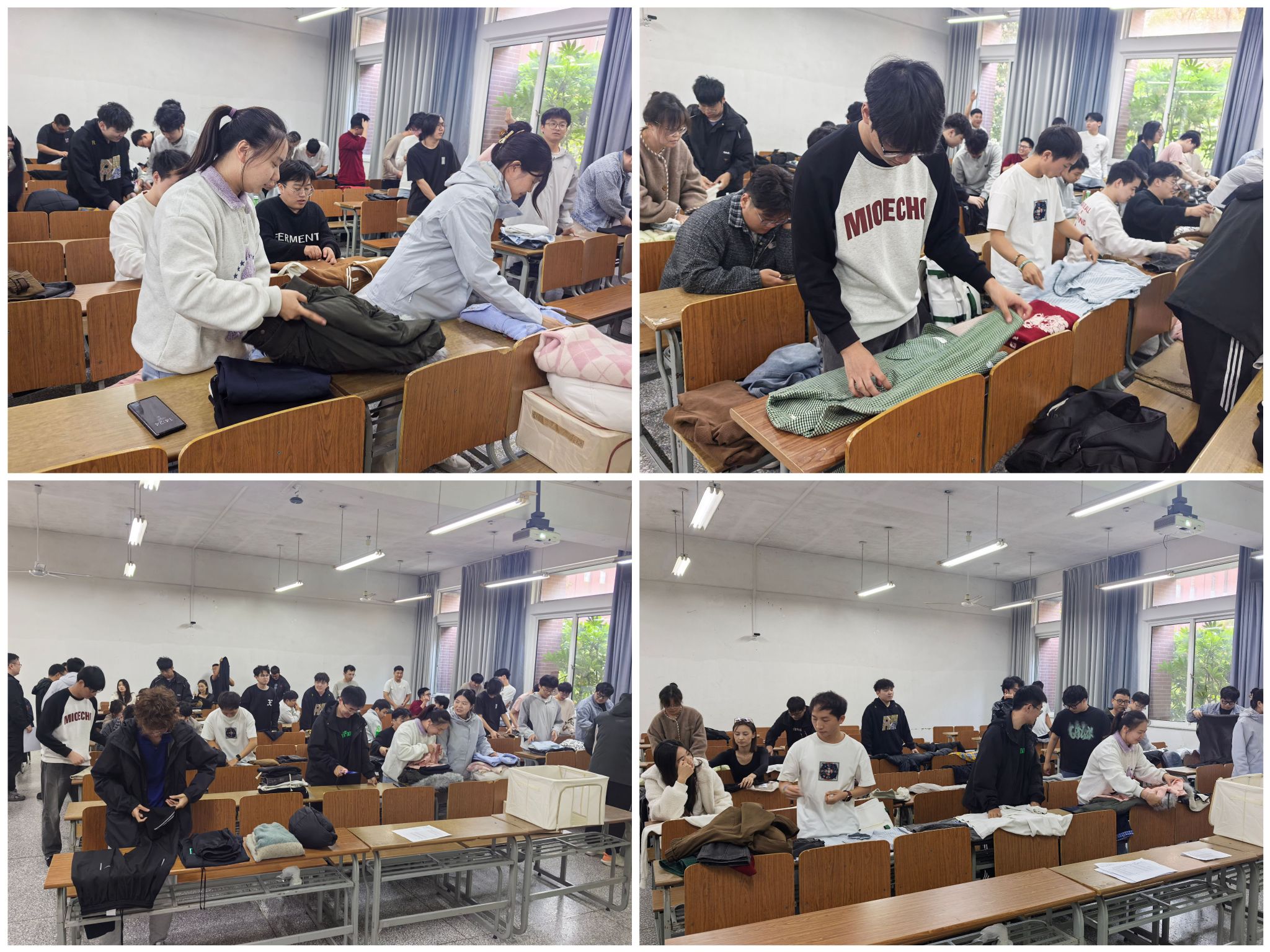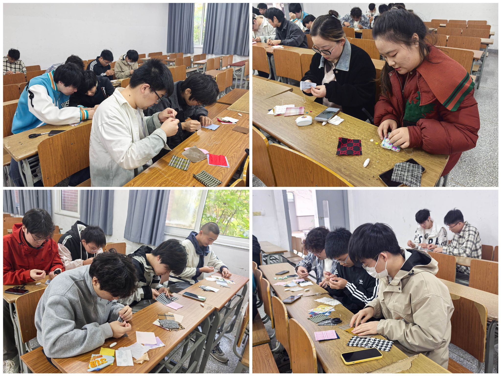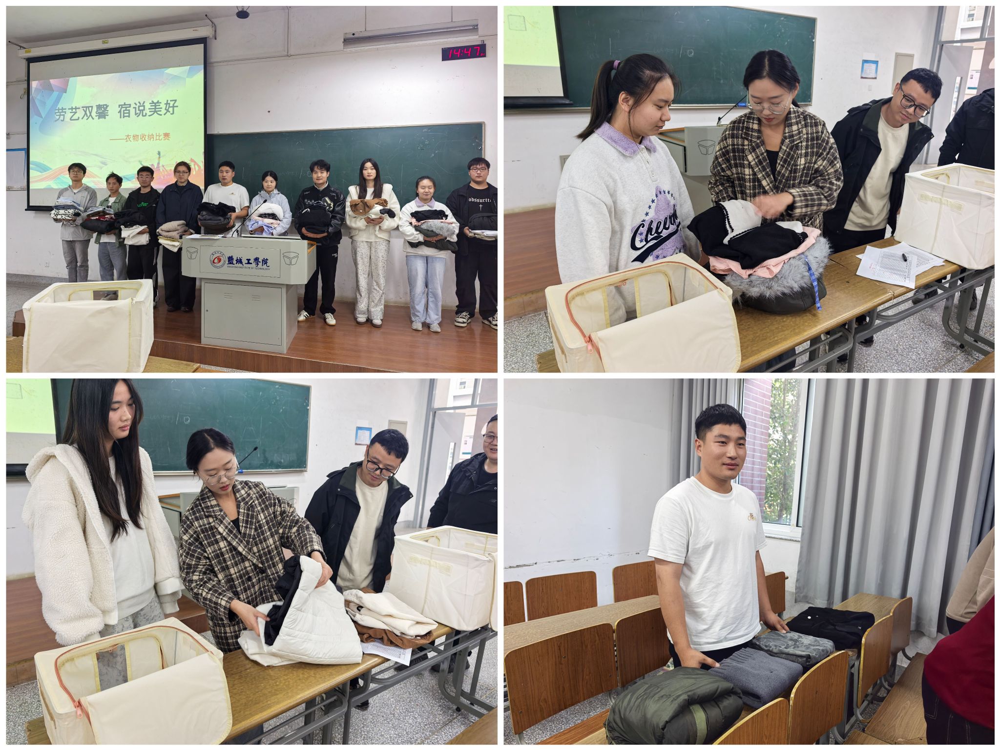线下赛场设在博学楼,气氛紧张而热烈。“衣物收纳”赛道不仅比拼完成速度,更注重折叠的标准度与成品的美观度。经过初赛严格筛选,共有18位选手脱颖而出晋级决赛,并最终角逐出优胜者。“手工缝纫”赛道上,选手们在规定时间内飞针走线,精心完成手工作品,由评委依据成品质量进行最终评定。