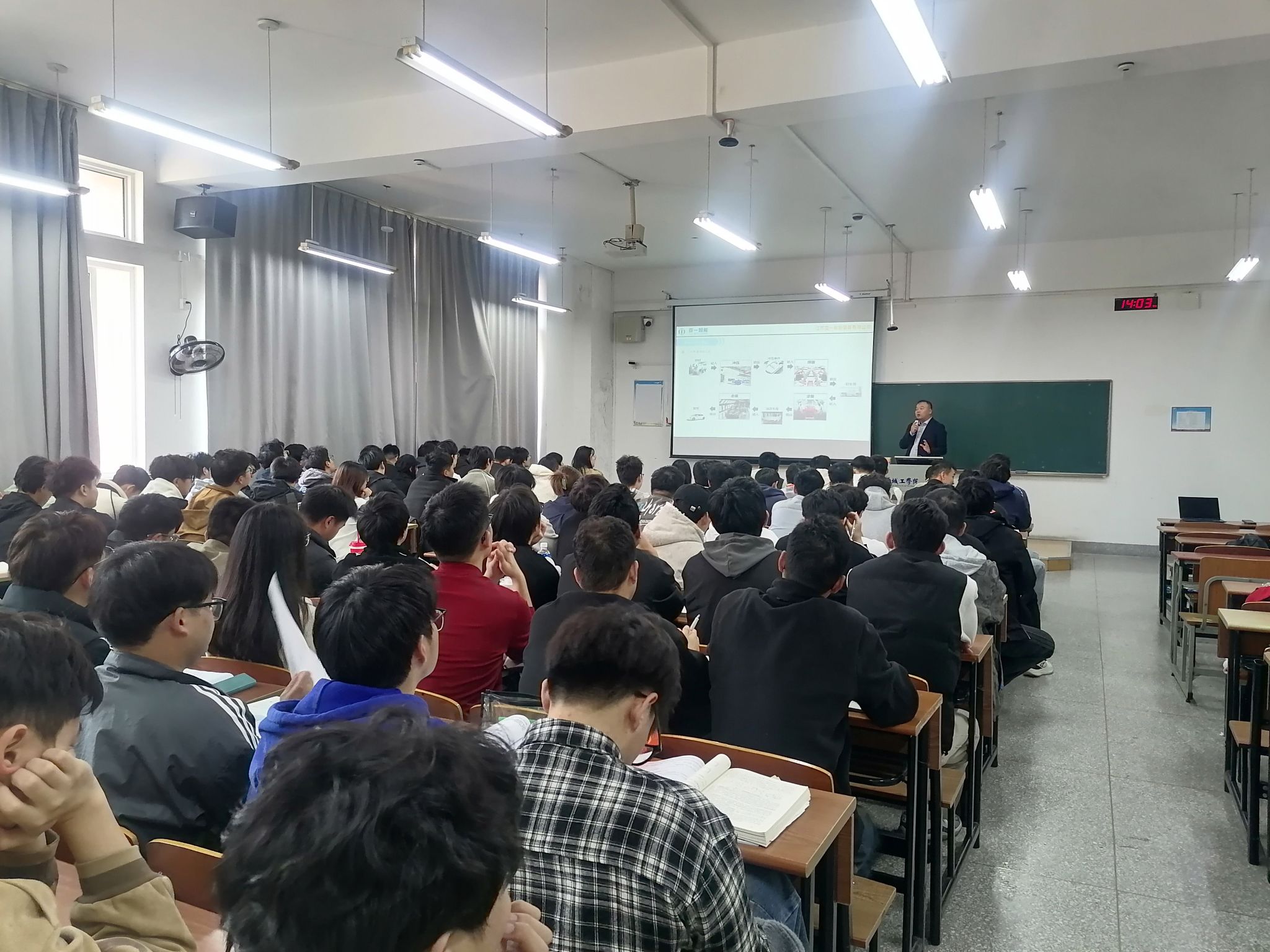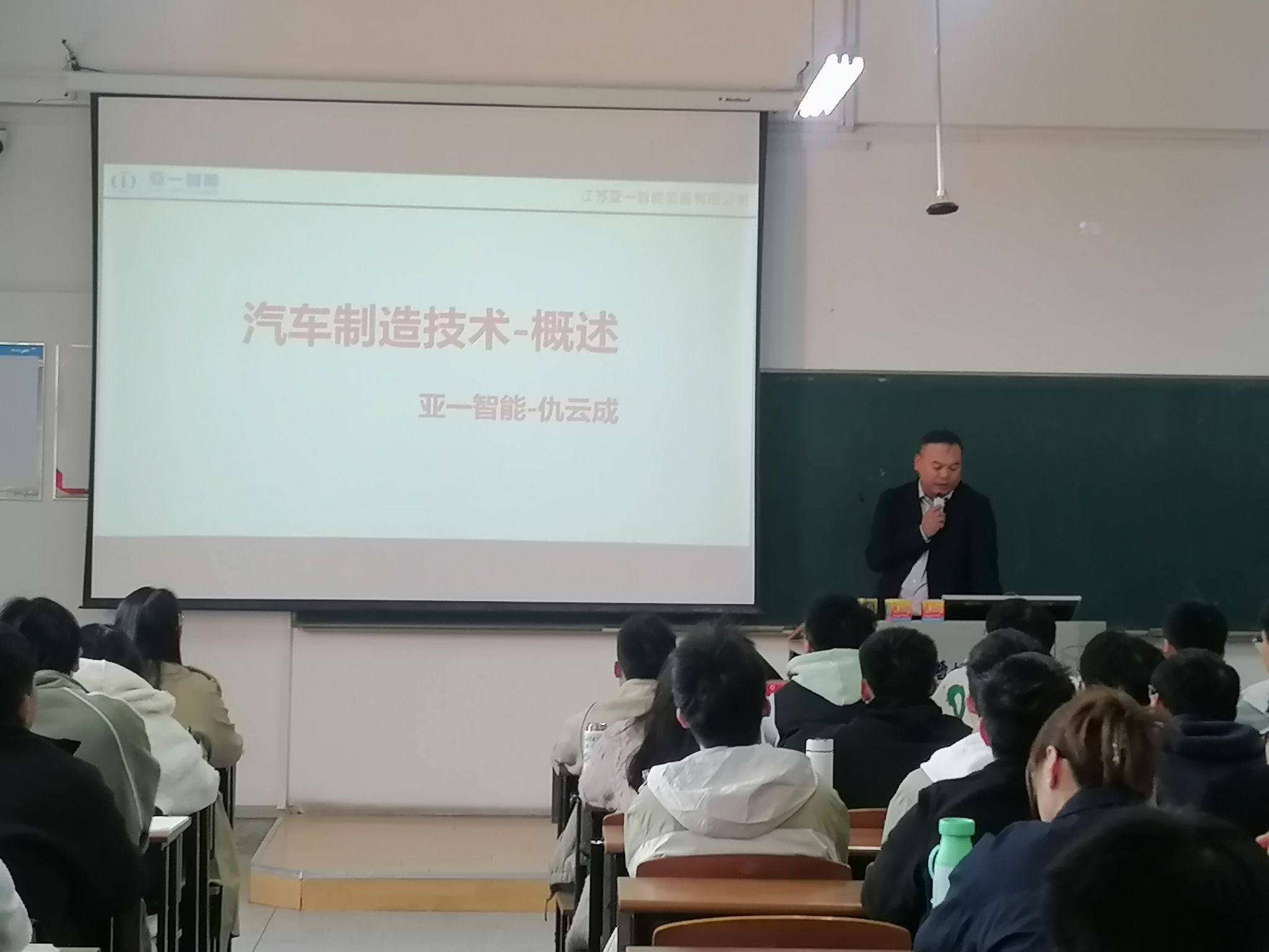 推进产教融合是应用型高等院校提高人才培养质量的重要方向,为进一步深化产教融合,提升校企合作的力度和广度,促进人才培养质量的提高,2025年11月04日晚,学院邀请江苏亚一智能装备有限公司董事长仇云成,在博学楼D409为学生讲授汽车制造工艺实践课程。