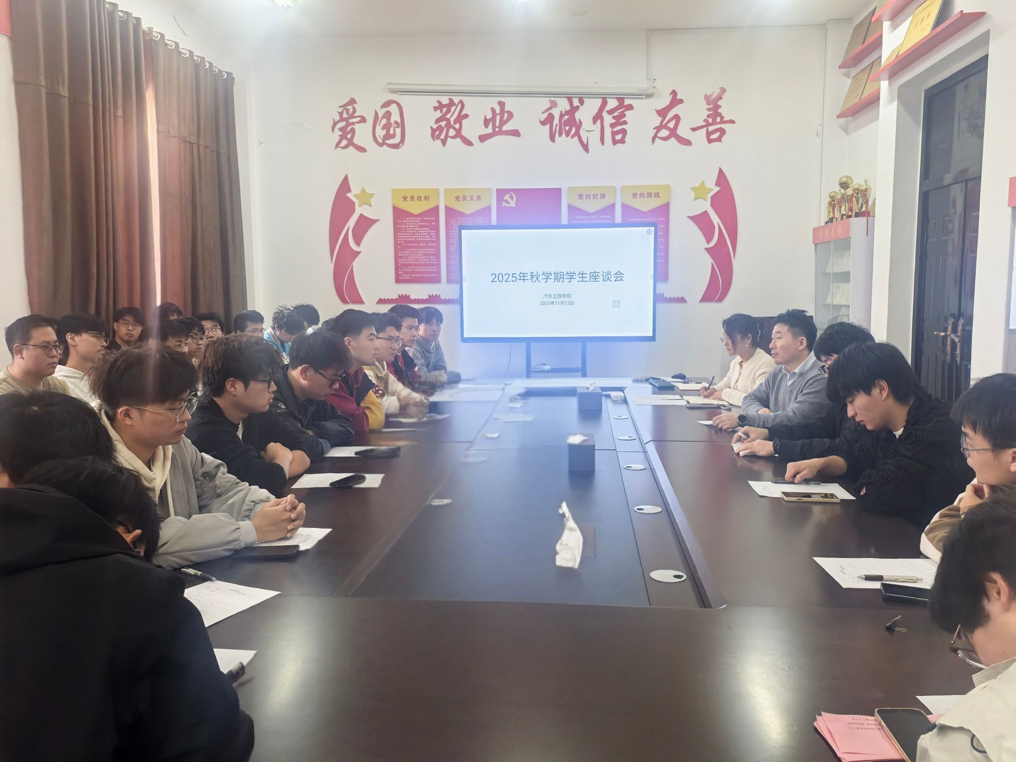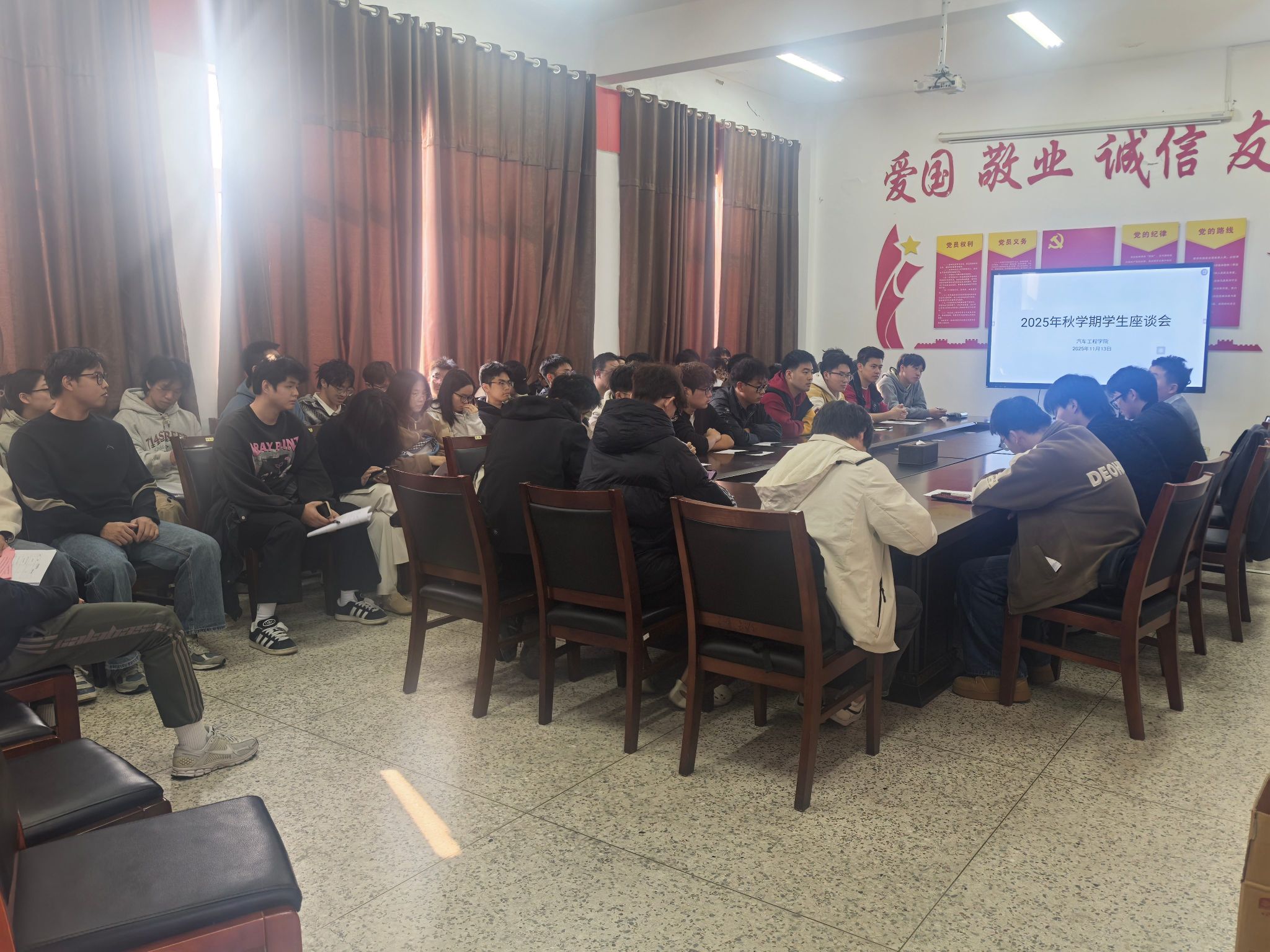 2025年11月13日,在机械馆A323会议室开展学生座谈会。本次座谈会旨在听取学生对教学、管理等方面的意见和建议,加强学院与学生之间的沟通与交流,推动我院教学质量的不断提高。会议由教学院长郑竹安主持,教科研办公室主任徐忠华、副主任倪兴雅,以及大三大四共54名学生代表参加会议。