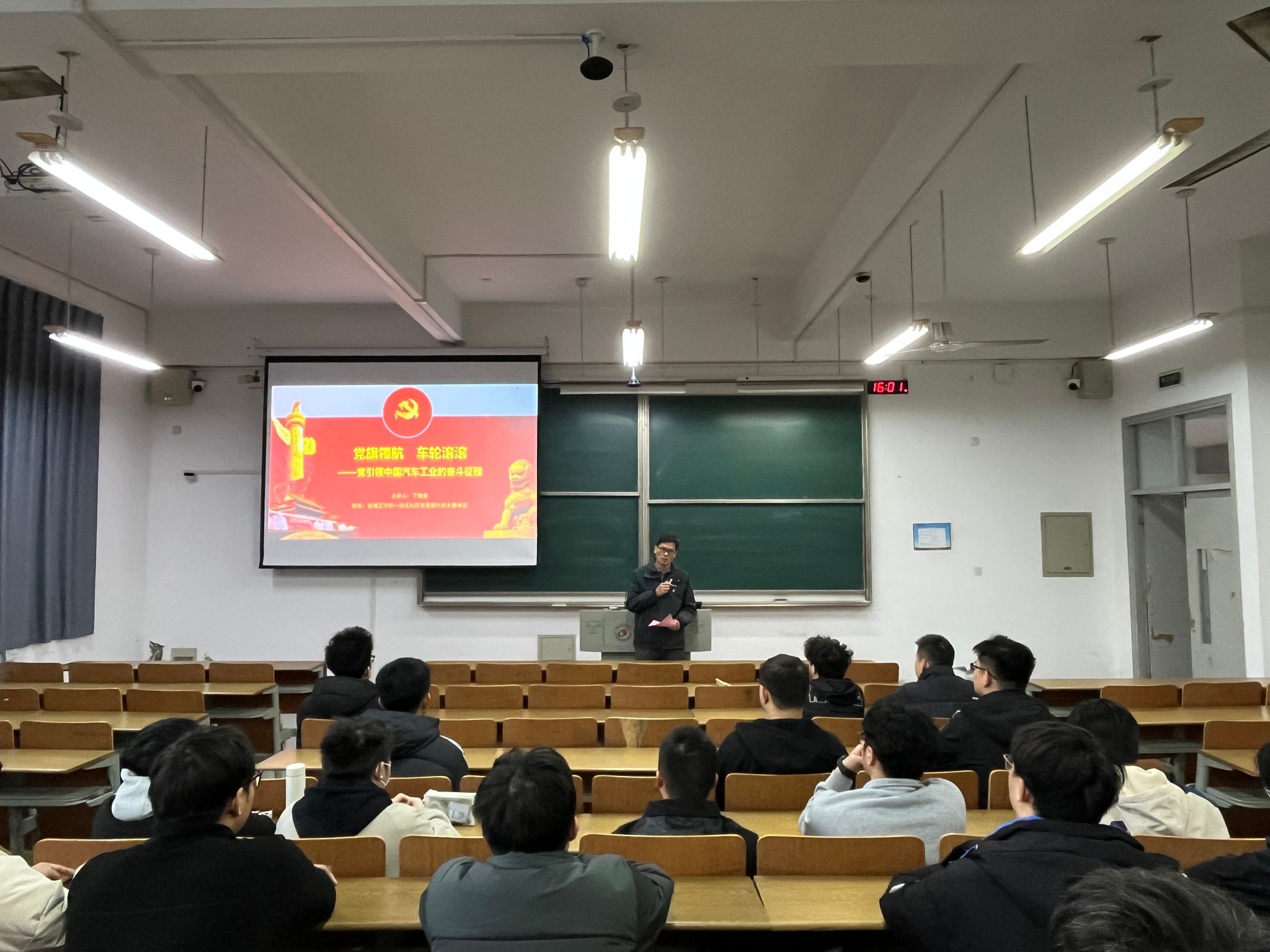党课以时间为轴,系统梳理了党引领中国汽车工业70余年的奋斗征程。结合珍贵史料片段、数据图表与典型人物故事,深入解读了中国汽车工业发展背后蕴藏的三大精神密码:一是“产业报国” 的初心矢志不渝,从毛主席 “三年建成”的殷切嘱托到新时代“汽车强国”的宏伟目标,党始终将汽车工业与国家命运、人民需求紧密相连;二是“攻坚克难”的精神熠熠生辉,荒原建厂的寒冬、三线建设的深山、合资探索的迷雾、芯片攻关的困境,每一次突破都离不开党员冲锋在前“啃硬骨头”;三是“与时俱进” 的创新永不止步,从“红旗”轿车的自主试制到新能源技术的全球领跑,党始终引领行业顺应时代潮流、在开放中自强。最后,丁德惠鼓励各专业同学要把课堂所学与产业需求紧密结合,在智能网联、新能源技术等领域勇攀高峰。