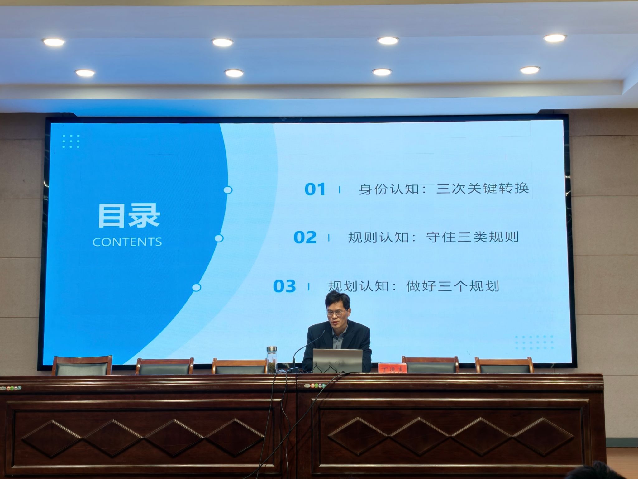 讲座中,丁德惠结合“上大学的意义”这一核心问题,引导新生跳出“只为毕业证、学位证”的单一认知,实现从“知识积累”到“完整人格塑造”的跨越。丁德惠首先阐释了身份认知的内涵,重点讲解了大学新生如何完成从“中学生”到“大学生”,找准“大学生”身份,再从“大学生”到“准社会人”的三次关键“身份迭代”;解读了规则认知的定义与重要性,强调作为大学新生,认识并遵守不同层面的规则,是适应校园、规避风险、少走弯路的重要保障,帮助新生“安全前行”;详细讲述了规划认知的核心内涵,明确提出新生需做好大学四年规划、未来就业升学规划、未来人生定位规划三大规划,引导新生从行业趋势、社会需求、个人兴趣三个方面找准自身定位,将个人成长与行业、社会需求紧密结合。