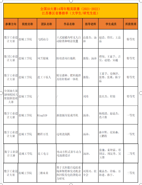 2022年春学期,我校汽车工程学院积极组织学生参加全国、省各类学科竞赛,继5月27日在江苏科技大学举办的“第九届江苏省大学生机械创新设计大赛”荣获三等奖后,又在近期结束的全国三维设计(3D)大赛14周年精英联赛、中国大学生电动方程式大赛和全国大学生节能减排社会实践与科技竞赛中再创佳绩。其中3D大赛,汽车工程学院由近40余名学生组成的11支队伍参赛,最终荣获江苏赛区特等奖4项、一等奖2项、二等奖2项;2021中国大学生方程式系列赛事获MATLAB/Simulink车辆动力学仿真奖—优秀奖 、年度优秀传播团队奖和总成绩三等奖;全国大学生节能减排社会实践与科技竞赛荣获三等奖,以上赛事均进入全国普通高校大学生竞赛排行榜。