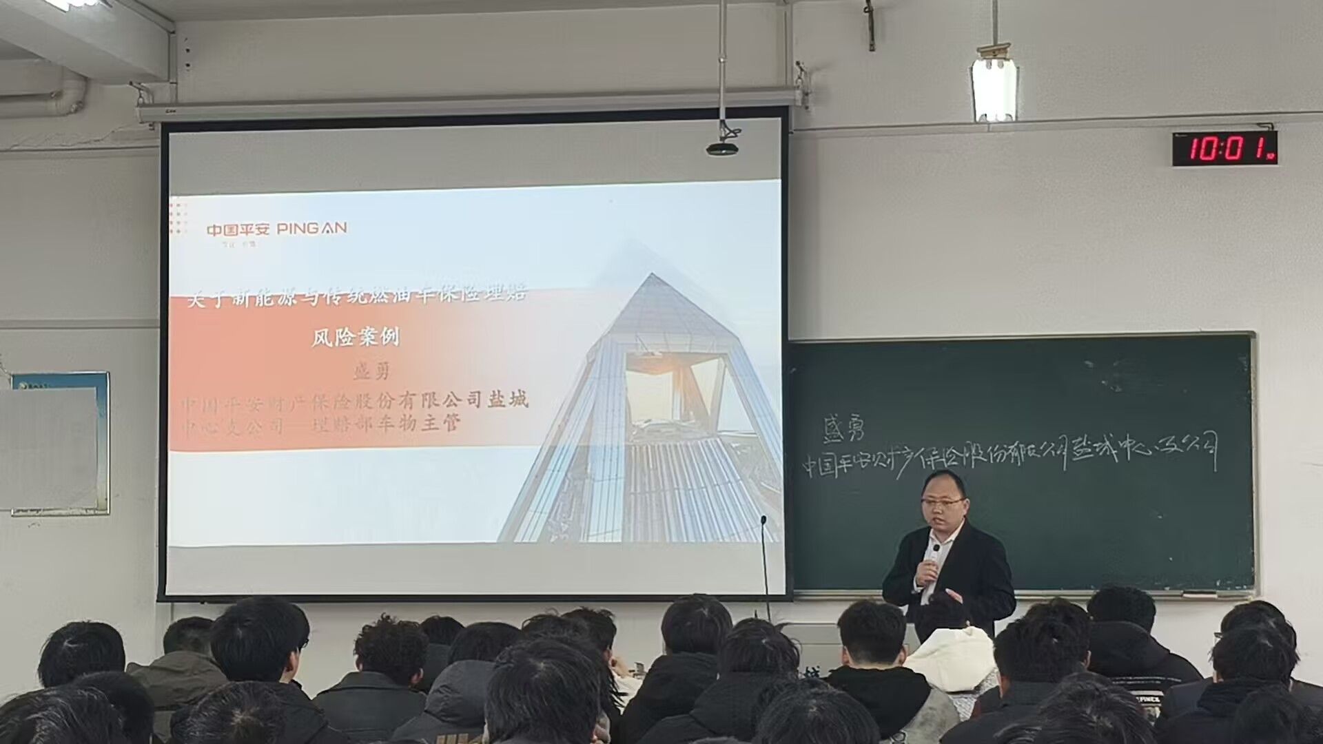 为深化产教融合,创新人才培养模式,汽车工程学院于2025年12月12日在博学楼A402开展了汽车保险与理赔产教融合课堂教学活动。本次活动特邀中国平安保险公司盐城中心支公司理赔部盛勇主管,结合车险企业理赔岗位典型工作任务和具体实际案例进行汽车保险与理赔产教融合课程授课,汽车服务工程专业2023级100余名学生认真听取了企业专家讲座。