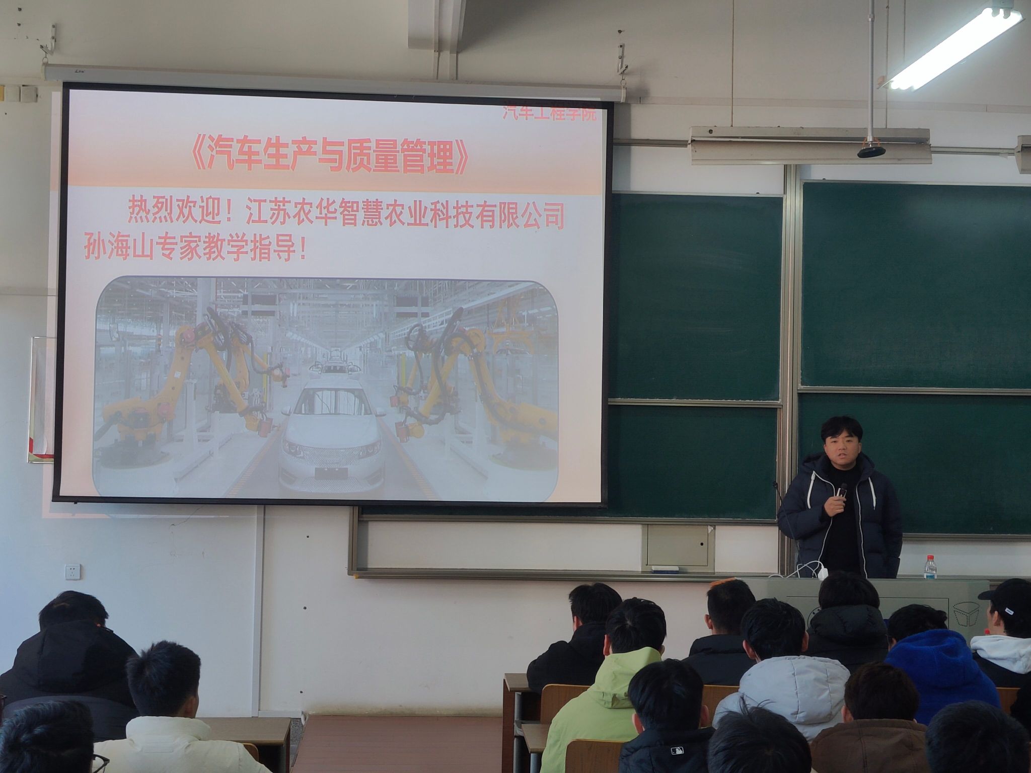 12月26日下午,我院特邀江苏农华智慧农业科技股份有限公司总经理助理孙海山,为汽车服务工程专业140余名学生带来了一堂精彩纷呈的《汽车生产与质量管理》产教融合课程。