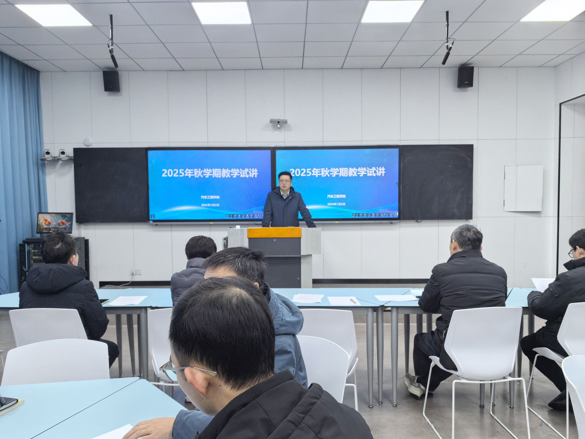 为确保新学期新增课程教学质量和教学效果,2026年1月6日下午,在博学楼D314,汽车工程学院举办2025年秋学期教学试讲活动。孙长城、唐杰等9名拟承担新课程教学任务的教师参与试讲。教务处副处长孔剑锋,朱龙英教授、马如宏教授,汽车工程学院院长刘玮,副院长熊新担任评委,副院长郑竹安与部分青年教师现场观摩学习。