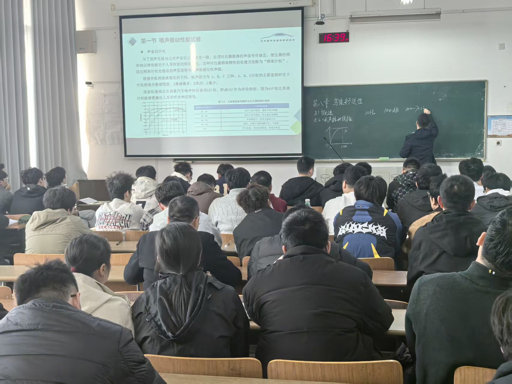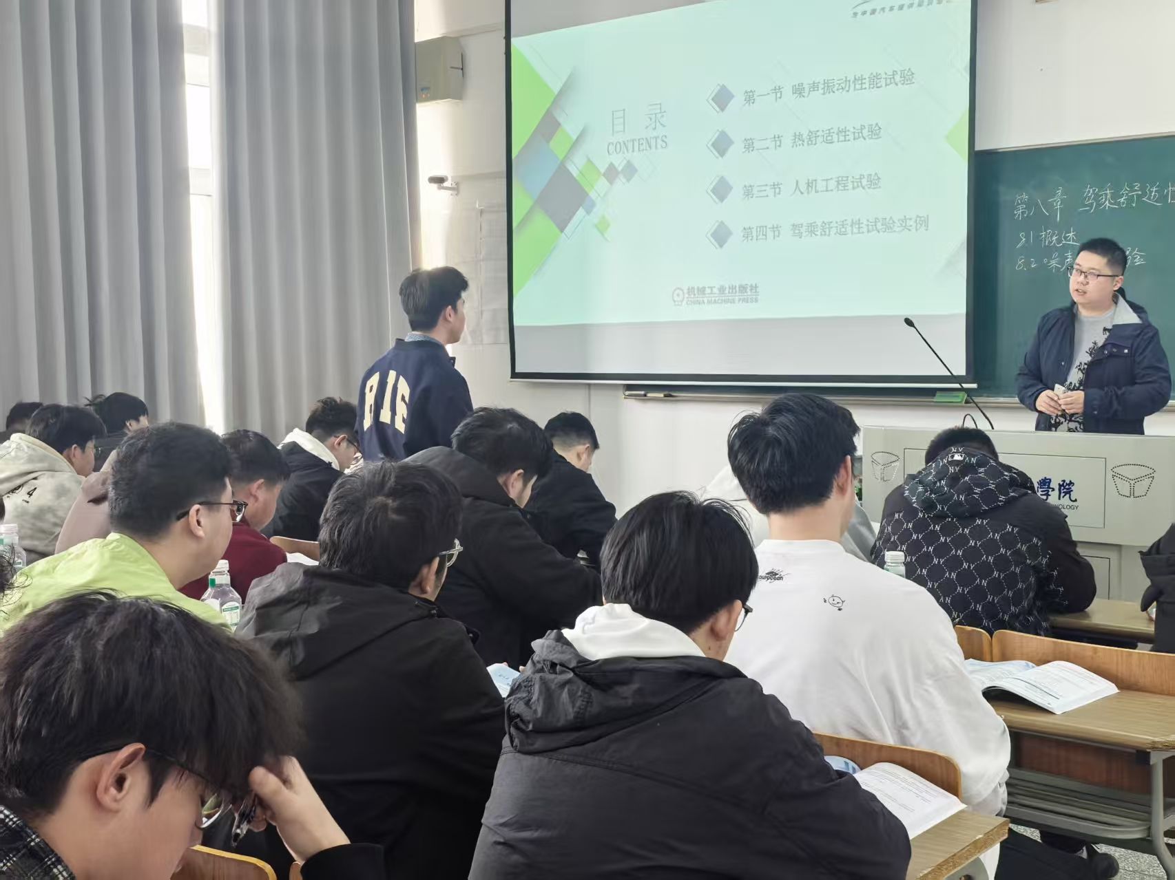 课上,朱乃宣以课前导学开启教学。他首先通过回顾提问梳理上节课核心知识点,引导学生学习的积极主动性。针对本次课内容“第八章 驾乘舒适性”,朱老师通过提问,以学生视角思考影响驾乘舒适性的关键因素有哪些?学生们结合生活经验与专业认知,从座椅设计、噪音控制、智能交互等多维度展开讨论,朱老师总结并引出本节课的教学重点——驾乘舒适性的评价指标与试验方法。