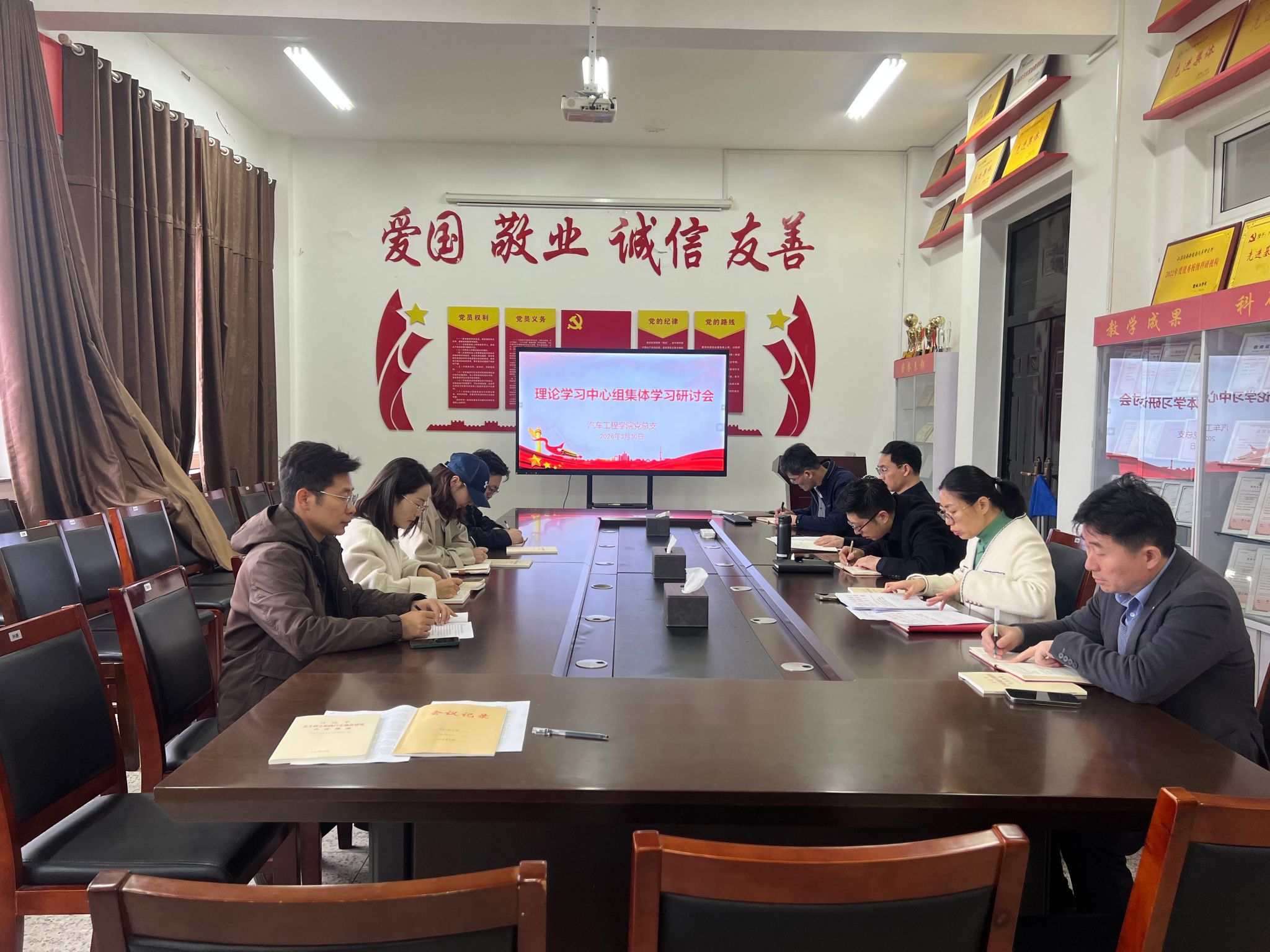 3月30日上午,汽车工程学院党总支理论学习中心组在机械馆A323会议室举行2026年春学期第一次集体学习研讨会,深入学习《习近平总书记地方工作期间坚持正确政绩观生动实践》《习近平关于树立和践行正确政绩观论述摘编》以及新修订的《中国共产党巡视工作条例》。党总支书记陈青主持会议,党总支理论学习中心成员参加。