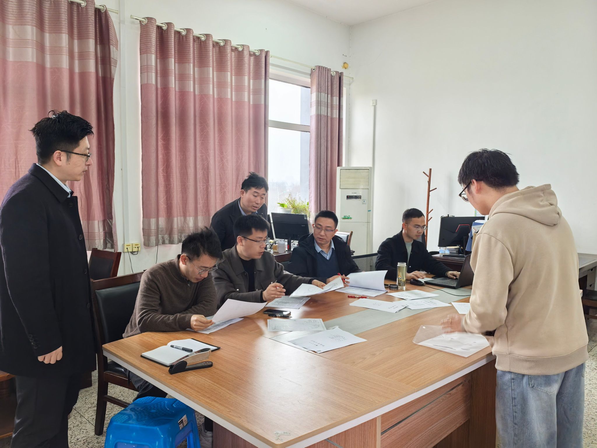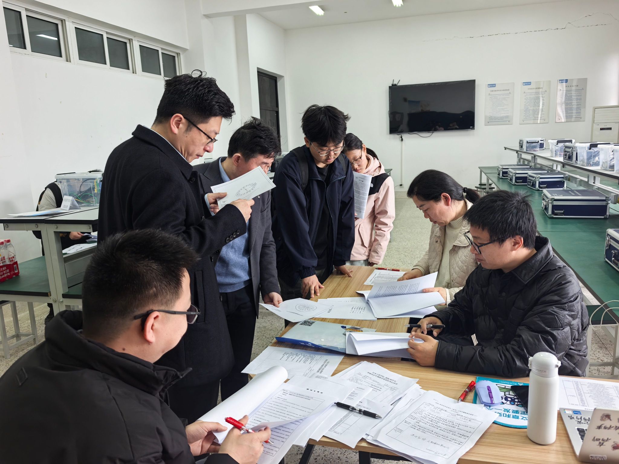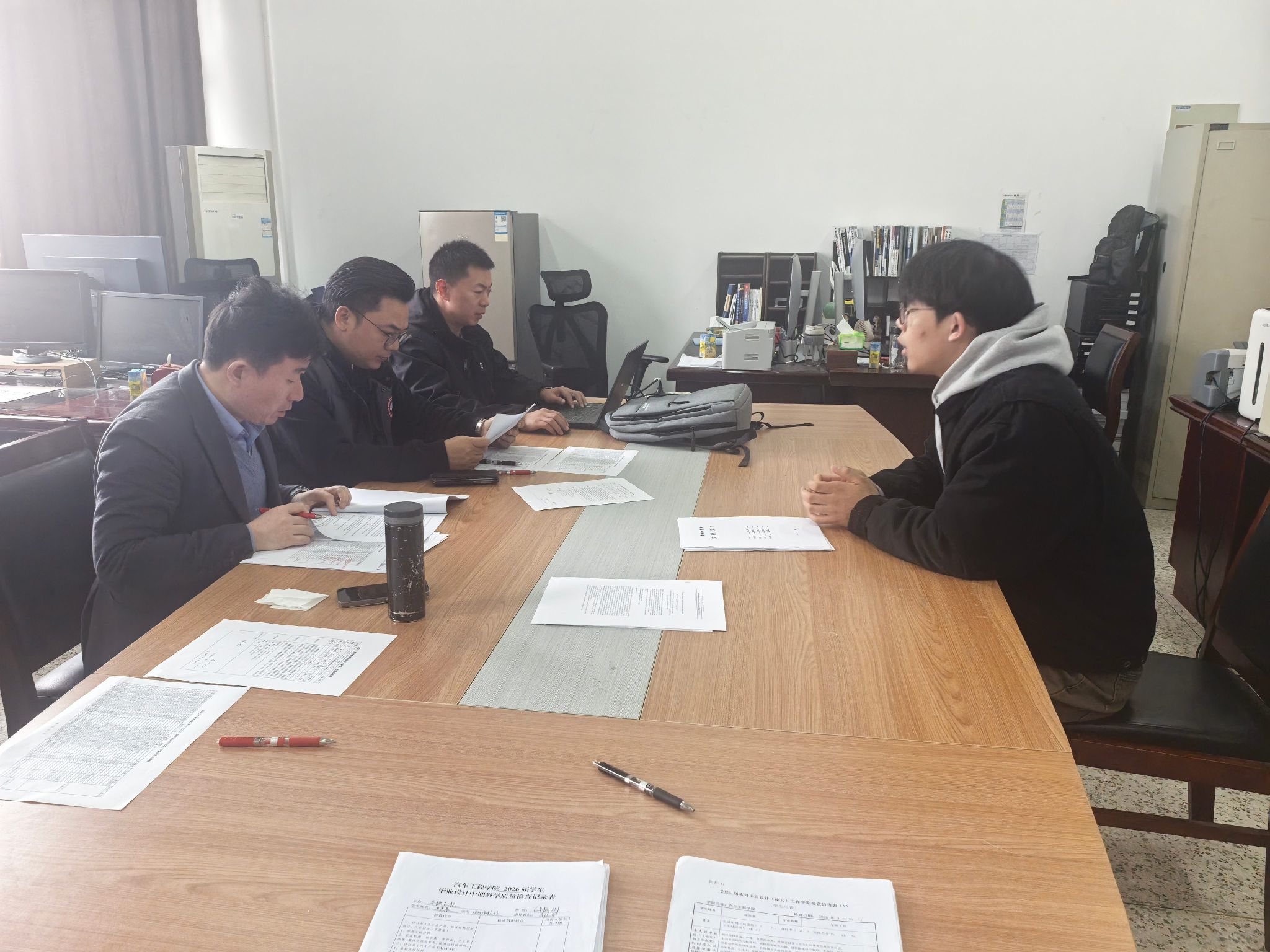 中期检查过程中,各检查组围绕毕业设计(论文)中期检查要求展开细致核查,包括选题合理性、前期材料完整性、图纸完成情况与论文完成度,以及过程管理等。目前,2026届毕业班学生已基本完成选题、开题报告、指导记录、中期检查等任务,部分学生完成论文初稿。同时,针对检查中发现的共性问题,检查组给出了建议。对于进度偏慢的同学,提出整改意见。