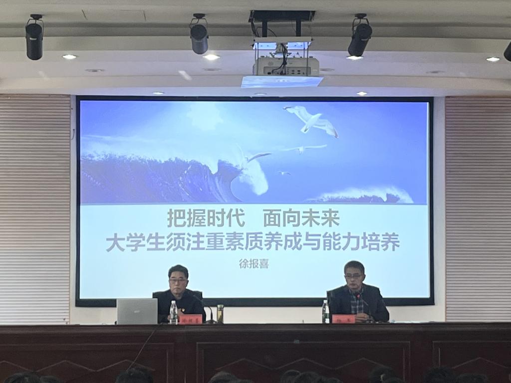 徐报喜以“从高中阶段到大学阶段的转变”为切入点,阐述了不同阶段教学方式的本质区别,从高中“要我学”到大学的“我要学”,呼吁同学们尽早适应学习模式的转变,强化自主学习的意识。他提出大学生应培养良好的素质与能力,注重思想道德素质、专业知识和智力素质、人文素质、心理与身体素质等四个方面素质的养成;加强综合分析、人际协调、信息真伪辨别、时间安排、创新创业、表达等六个方面能力的培养。他希望同学们把握时代,面向未来,更好地完善自我以适应当代社会发展的需求。