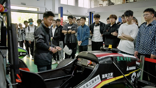 各车队队员聚集在风雨操场观摩我队车手日常练车流程,车手身着专业赛车服,驾驶我队E39方程式赛车在车道上飞驰。各车队相关队员聚集在一起,激情探讨各自在车队遇到的问题、面对的困境,其他同学也都倾囊相授,大方提出自己的见解,讨论解决方法,争取获得问题最优解。同学们交流经验,分享软件、技能,积极从其他车队的优势中找出自己的不足,从而更好地提升自己的实力。