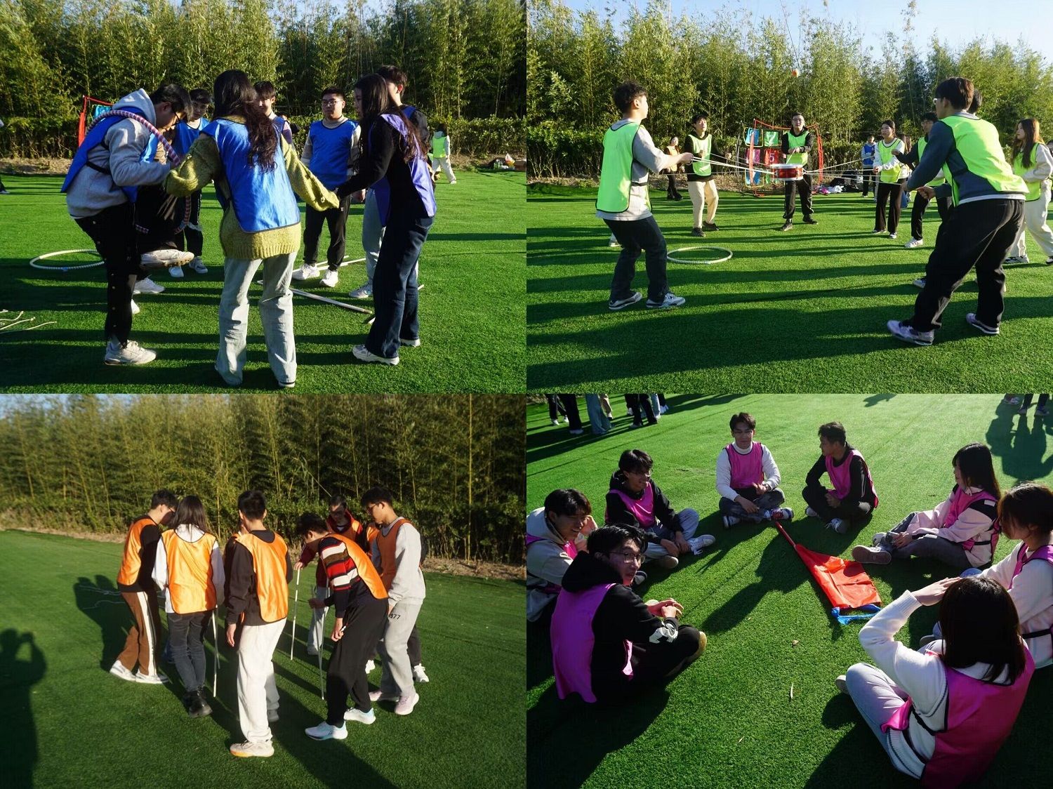 素质拓展活动在初冬的暖阳下正式拉开了帷幕。首先,在团队建设环节中,所有同学被随机分为四组,学生干部们发挥自己的才能,在与队员的积极讨论下设计出独一无二的队名、口号与队旗,并依次进行展示。游戏环节共设置“挑战150”、“飞盘嘉年华”、“桃花朵朵开”等多个项目,在活动过程中,大家默契配合、竭尽全力,尽情挥洒着青春活力。每个小组成员都能够换位思考,采取有效的沟通方式,形成高度一致的团队目标和正确的团队决策,齐心协力、全力配合,活动现场氛围热烈、积极向上。