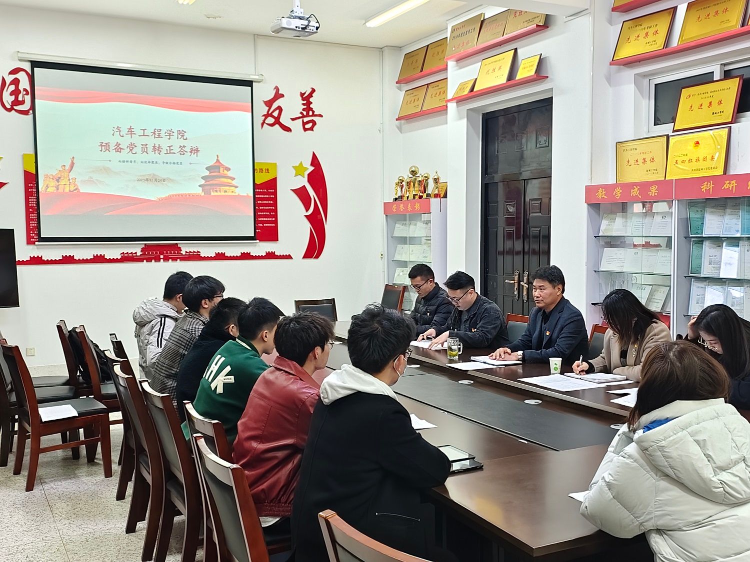 为规范党员发展程序,确保党员发展质量,按照《盐城工学院学生党员发展工作“三投票三公示一答辩”实施办法》要求,11月24日晚,汽车工程学院在南校区机械馆三楼会议室召开2023年秋学期预备党员转正答辩会。答辩小组由汽车工程学院原党总支书记张雷、汽车工程学院党总支副书记姜华、学生党支部书记孙进、支部委员姚源及研究生支部委员范景森等5人组成,14名预备党员参加答辩。